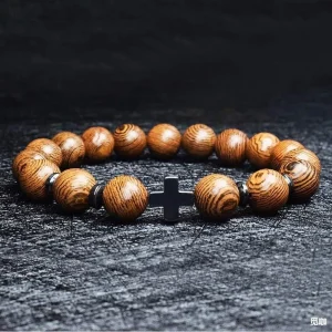 Pulsera de Cruz para hombre, Rosario religioso, cuentas de madera, pulsera de cu