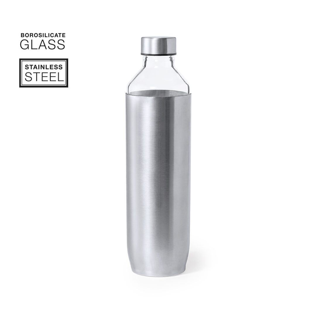 Bidón de diseño en alta calidad, de 850 ml de capacidad. Fabricado en cristal de borosilicato, que ofrece una resistencia, estética y durabilidad excepcionales, alargando su vida útil y pudiendo ser reutilizado infinidad de veces. Tapón y funda del cuerpo del bidón en acero inox. Presentado en atractiva caja de diseño.