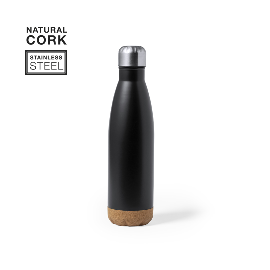 Bidón de 750 ml de capacidad, fabricado en acero inox. Con base en corcho natural y tapón a rosca, libre de BPA. Disponible en variada gama de colores satinados y presentado en caja individual de diseño kraft.
