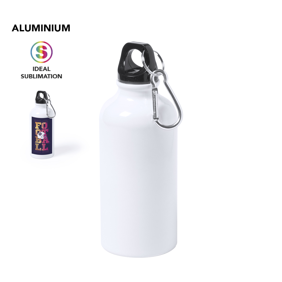 Bid贸n de 400ml de capacidad con cuerpo de acabado en suave y brillante color blanco, especialmente dise帽ado para marcaje en sublimaci贸n. Con tap贸n de seguridad a rosca y mosquet贸n met谩lico de transporte. Presentado en caja individual.
