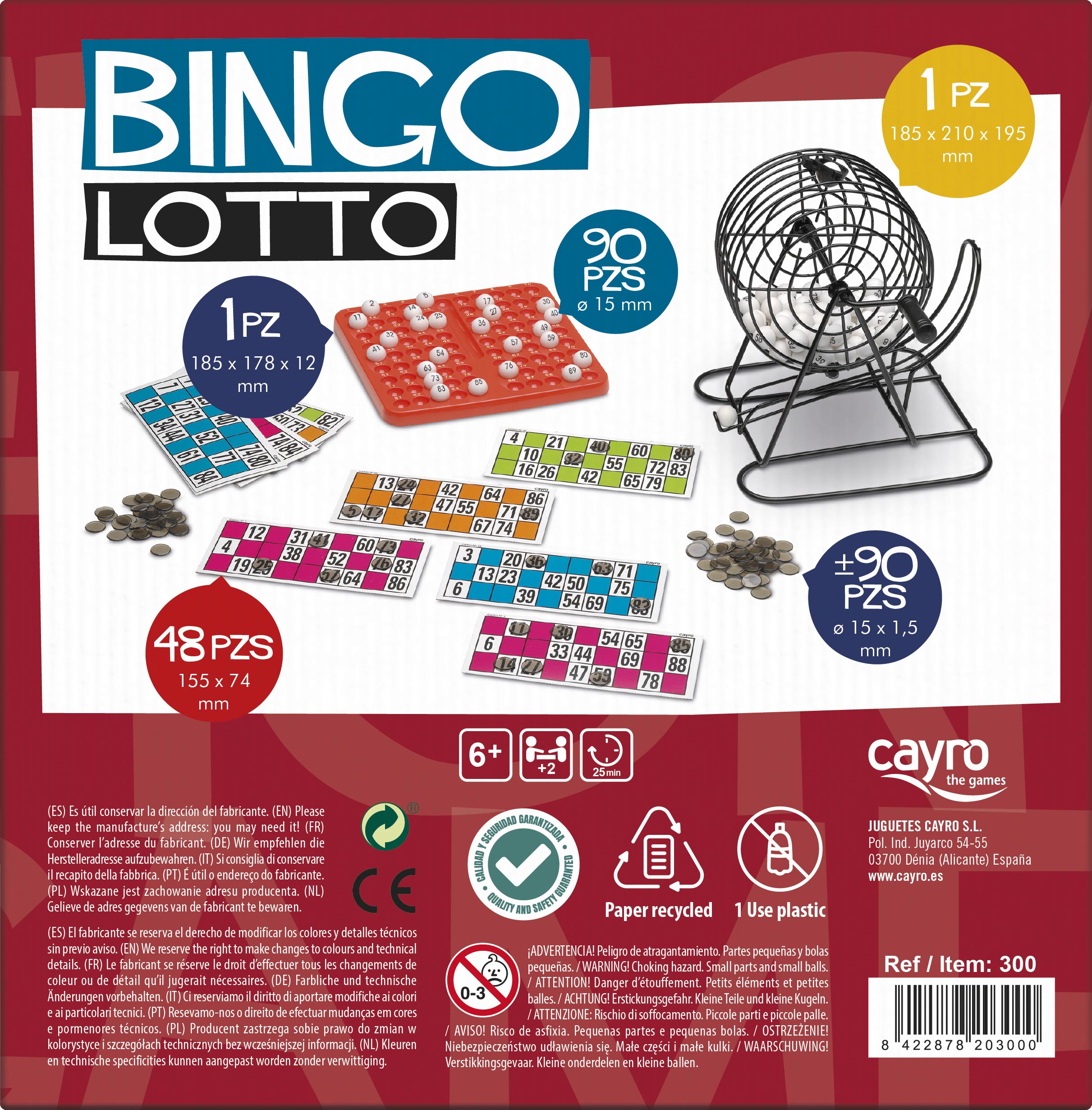 Con bombo de metal y bolas, base y fichas de marcar de plástico. Incluye 48 cartones