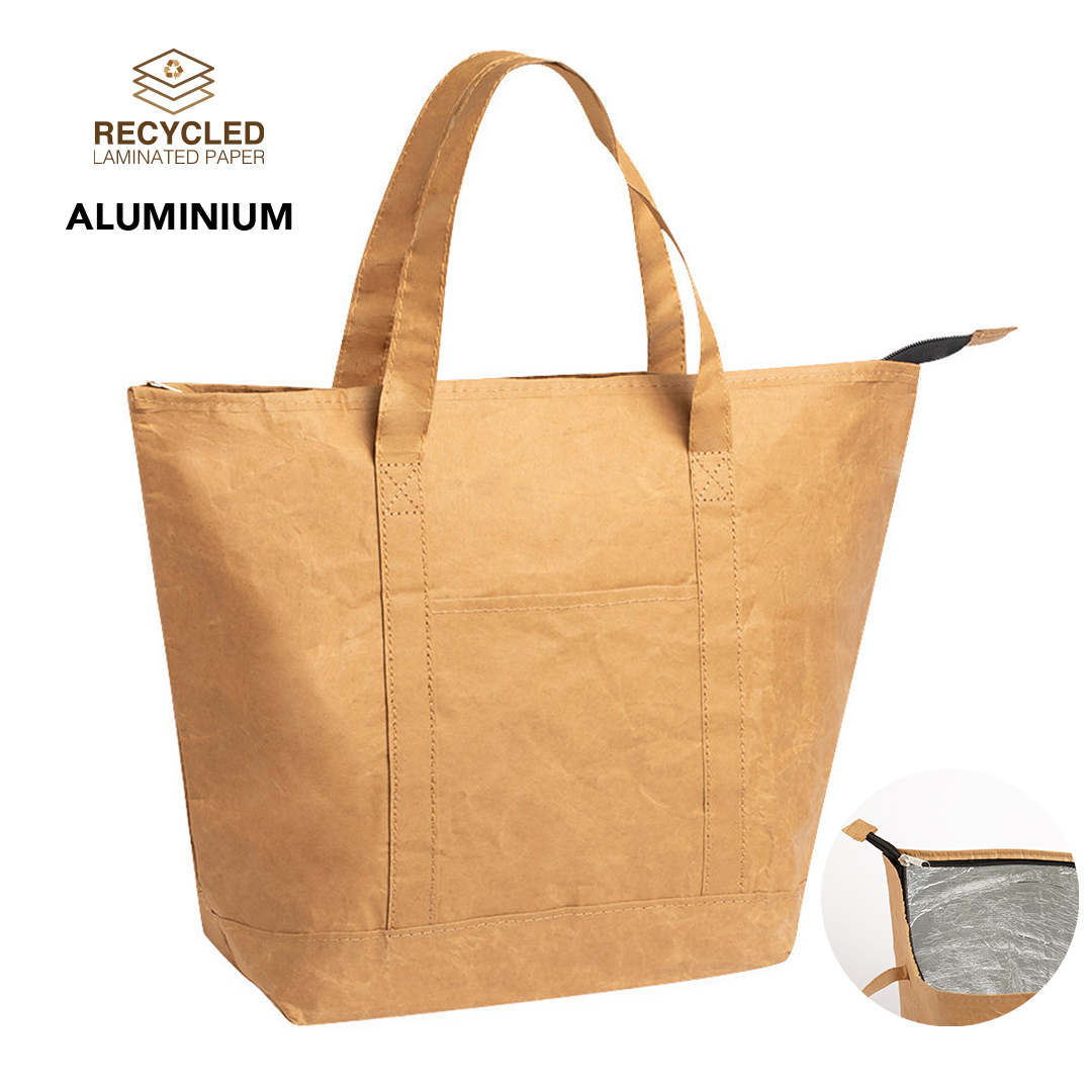 Innovadora bolsa térmica en papel laminado, resistente a las salpicaduras de agua y con interior en aluminio. Tamaño 43×33+14 cm, con cierre de cremallera y amplio bolsillo en frontal. Asas medianas reforzadas de 45 cm, libre de BPA.