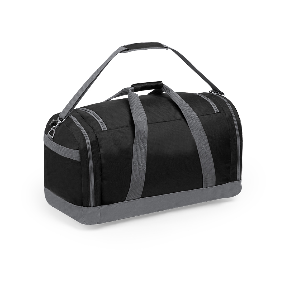 Bolso multiusos de gran capacidad en resistente poliéster 600D. De diseño bicolor, con base y detalles en color gris. Compartimento principal y bolsillos laterales con cierre de cremallera. Resistentes asas de transporte en nylon, con cierre de velcro a juego. Incluye cinta bandolera ajustable con cierre mosquetón y almohadilla de protección para el hombro a juego. Base reforzada.