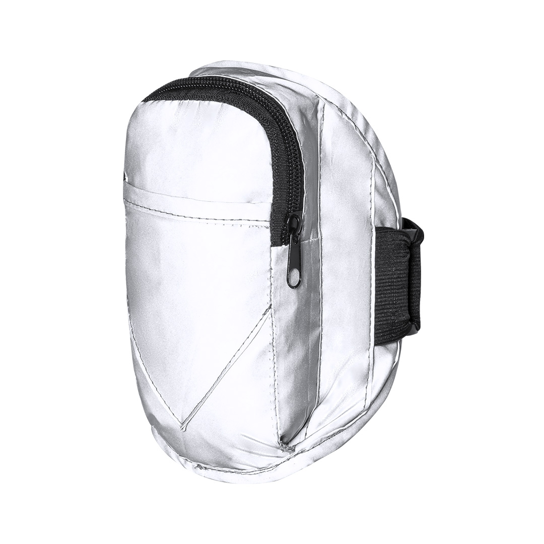 Brazalete deportivo en poliéster 210T, fabricado empleando tejido con gran capacidad para reflejar intensamente la luz, gracias a millones de pigmentos reflectantes y basándose en el principio de la retro-reflexión de la luz, una propiedad de visibilidad nocturna que consiste en la refracción de la luz hacia la fuente de origen de la misma. Bolsillo principal con cierre de cremallera y bolsillo frontal con cierre de velcro. Con tira ajustable elástica y resistente al agua.