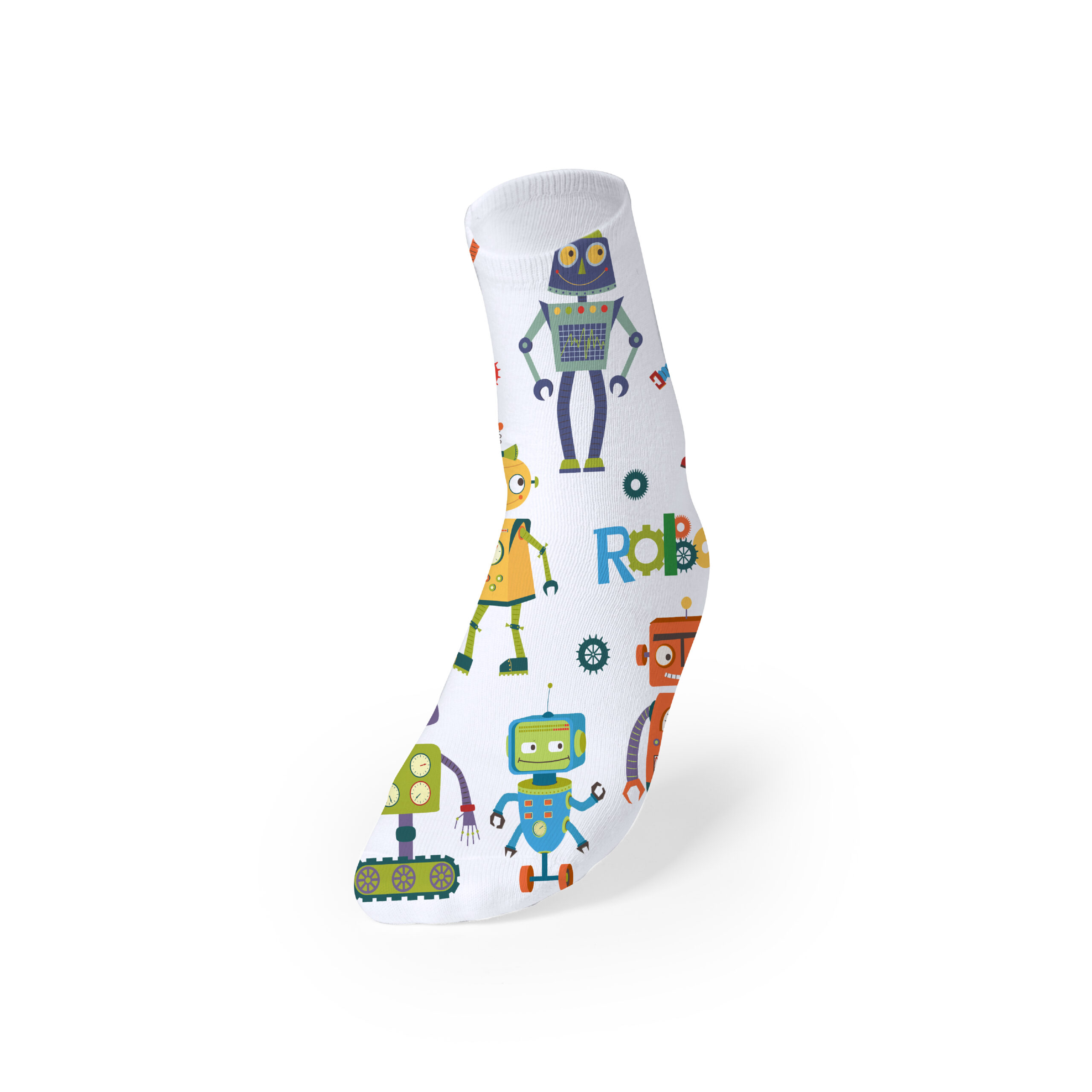 Par de calcetines fabricados en poliéster blanco y especialmente diseñados para marcaje en sublimación. En talla S-M.