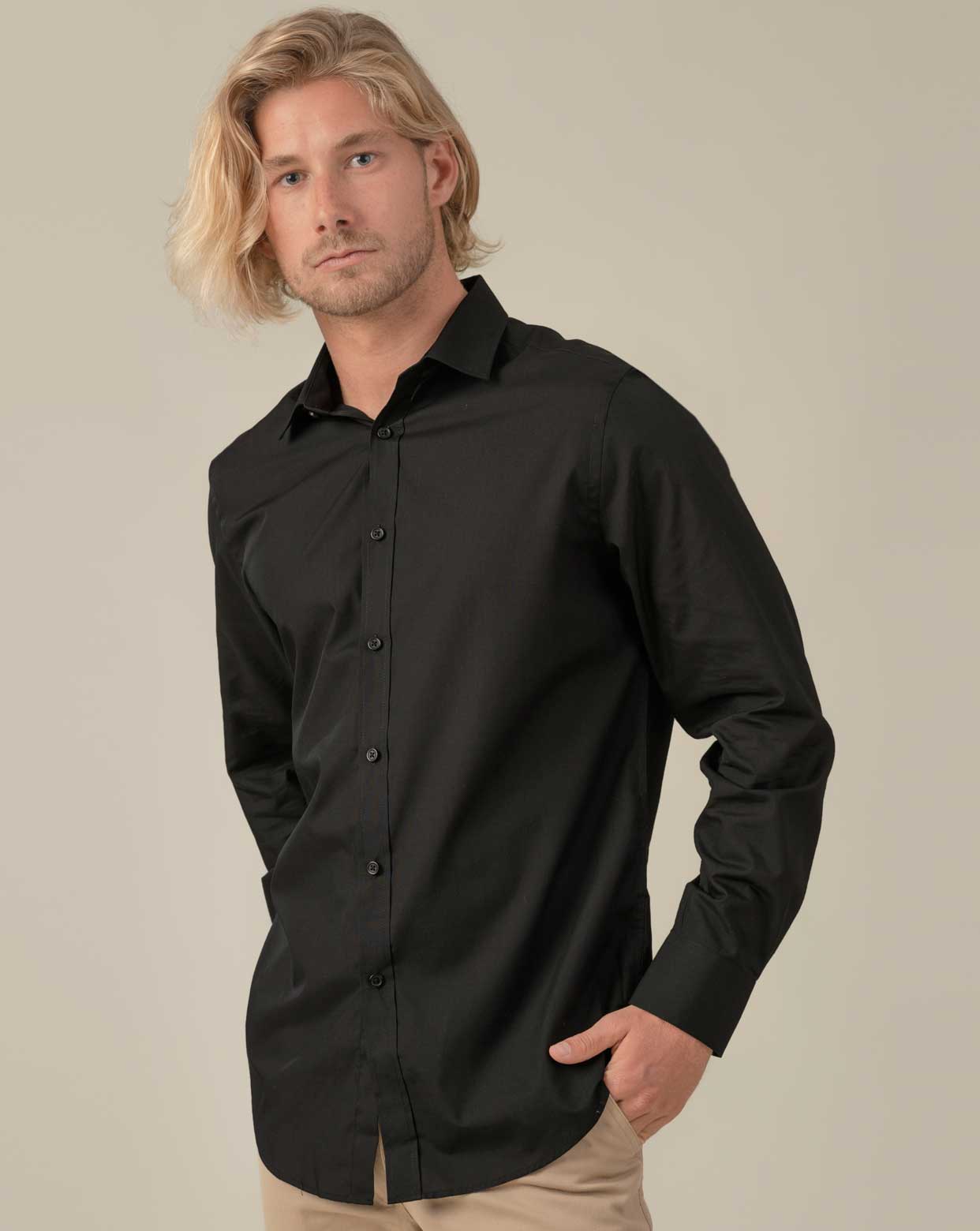Camisa antiarrugas y antibacterias para hombre y mujer. Entallada de manga larga, en popelín. Cuerpo ajustado. Botones a tono. Tapetas en mangas con botón y pliegue. Puños con dos botones.