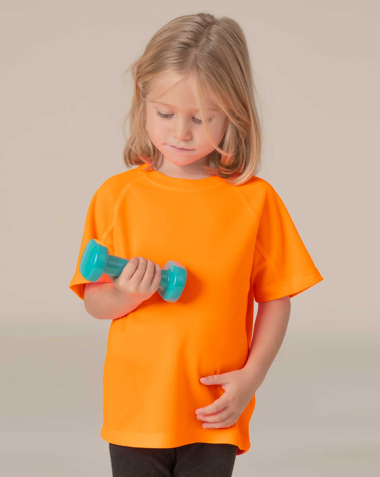 Camiseta deportiva unisex para niños de manga raglan corta con costura decorativa en media manga. Etiqueta removible. Disponible en 8 colores y desde la talla 3/4 años hasta la 12/14.