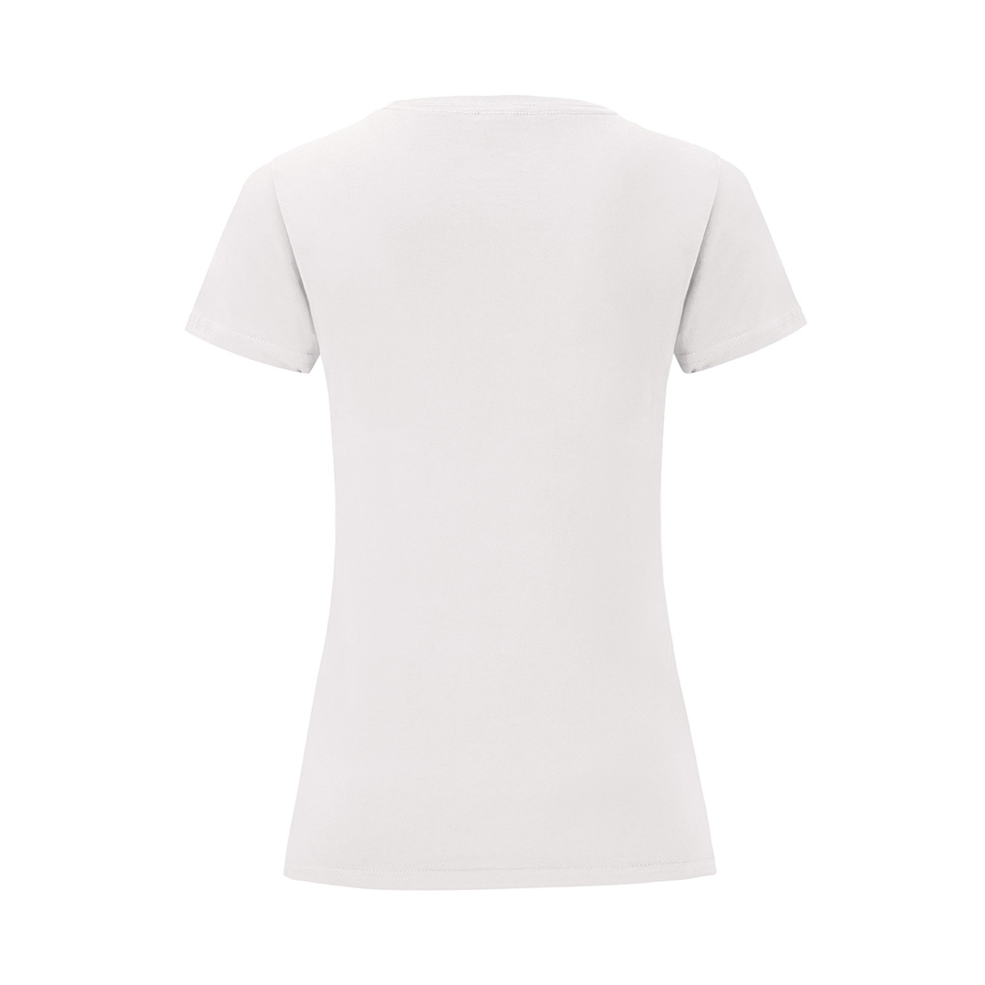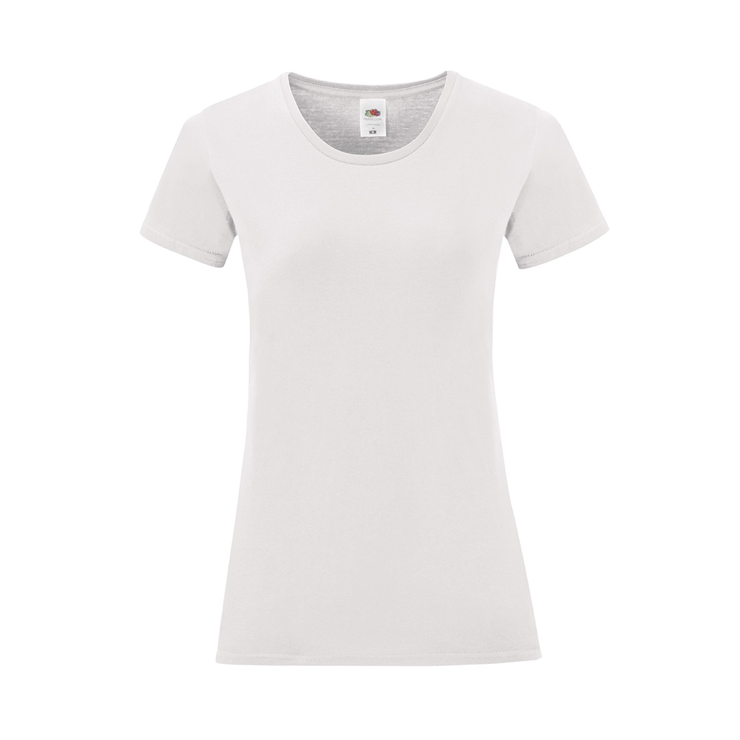 Camiseta para mujer blanca Iconic de Fruit Of The Loom. Fabricada en material 100% algodón peinado Ring Spun de 140g/m2. De tacto suave y corte entallado, con costuras laterales diseñadas para un ajuste perfecto. Con cuello redondo estrecho de canalé 1×1 y tapeta a juego. Etiqueta fácilmente removible y disponible en tallas XS, S, M, L, XL, XXL.