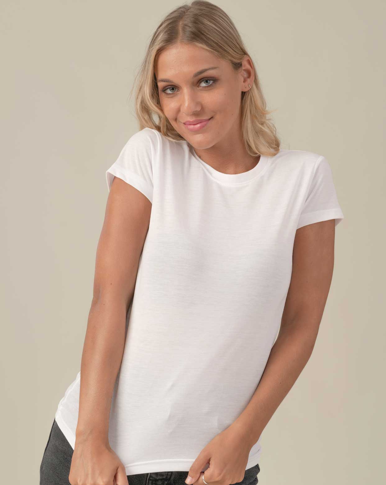 Camiseta de mujer de manga corta para sublimar. 100% poliéster. Tacto de algodón. Etiqueta removible.