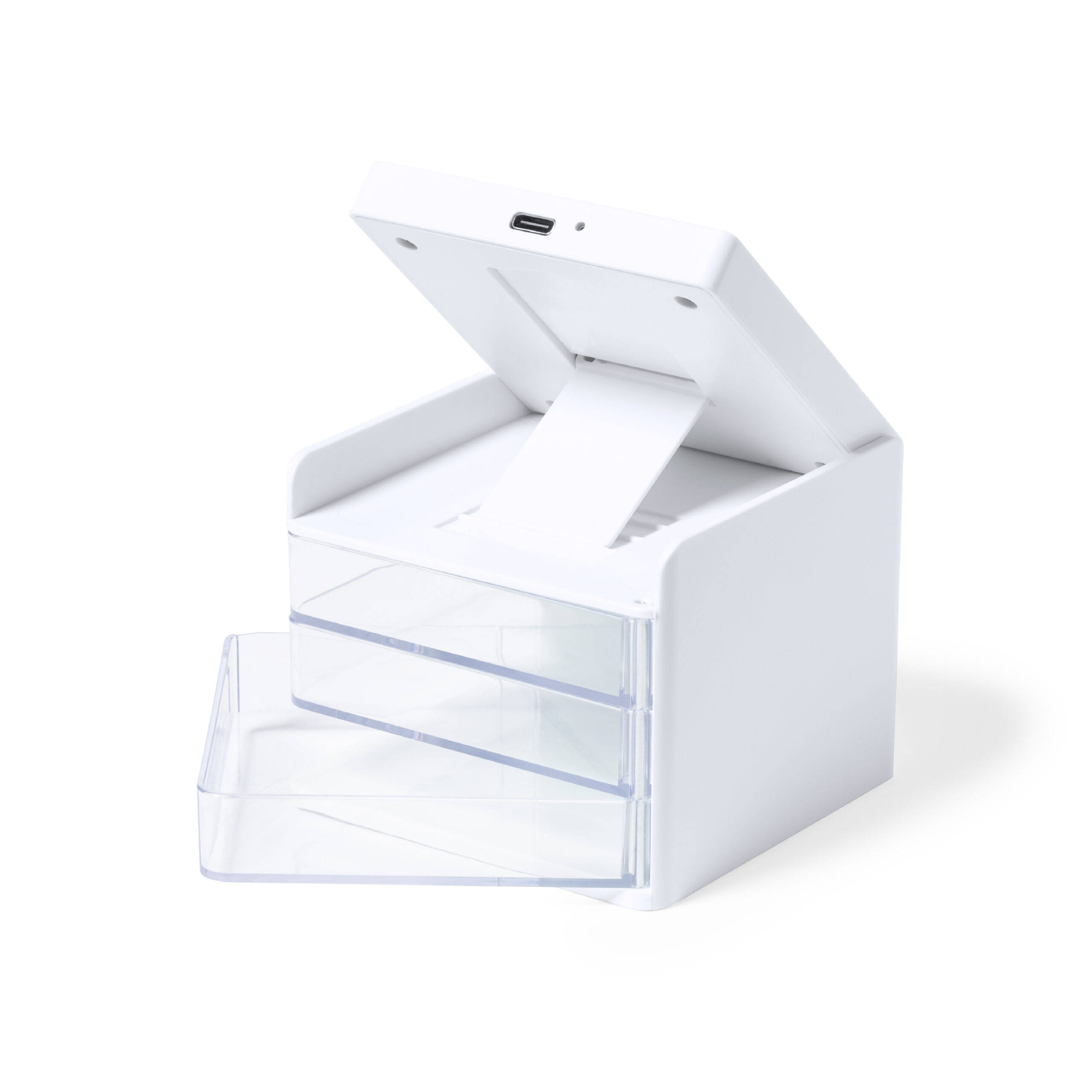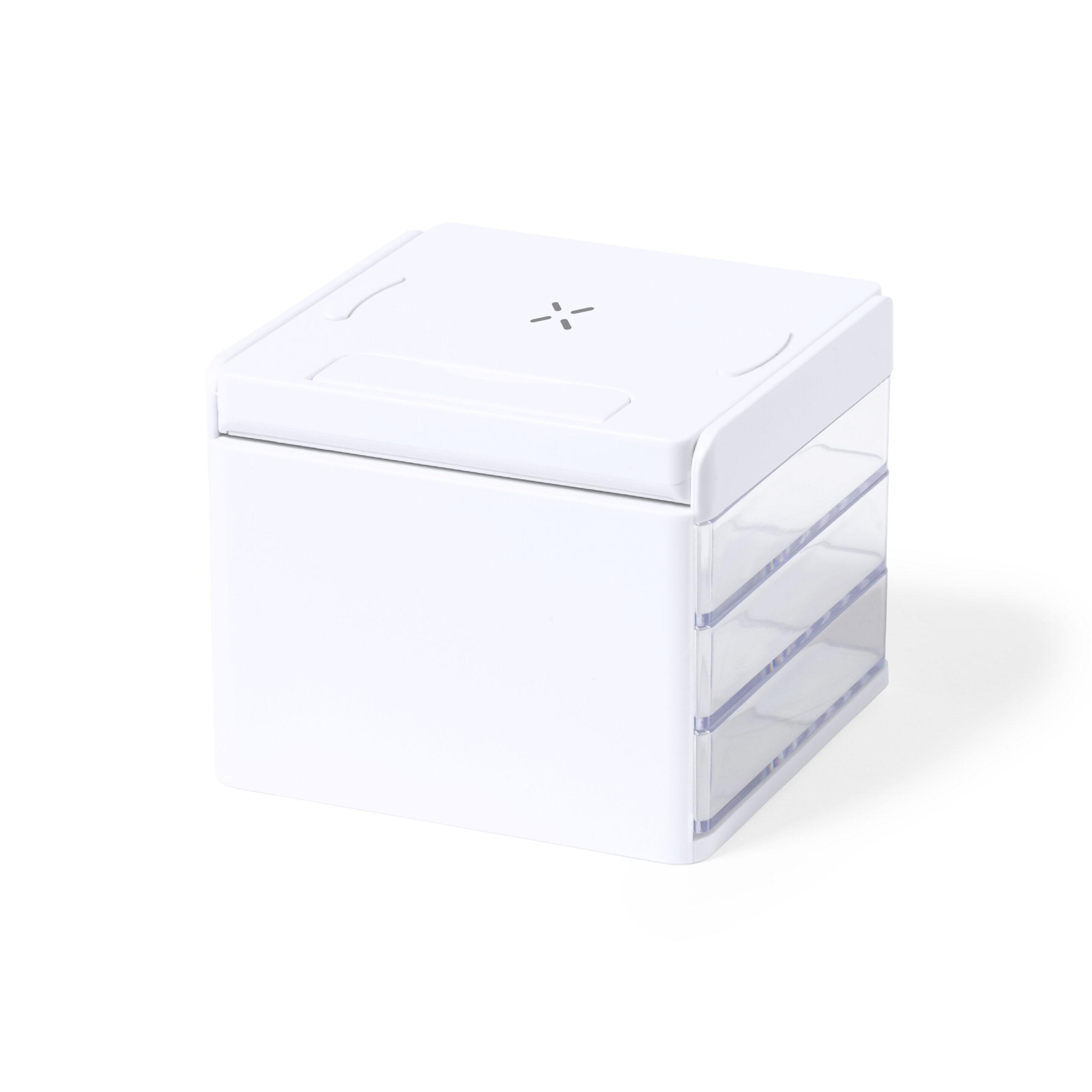 Cargador organizador con soporte para smartphone y cargador inalámbrico 10W integrado, compatible con dispositivos equipados con tecnología de carga inalámbrica Qi. Con 3 compartimentos de almacenaje transparentes y extraíbles. Indicador de estado de carga, con cable de carga Tipo C de 1 m incluido. Base antideslizante y presentado en caja individual de diseño kraft, con manual de instrucciones en español e inglés. Fabricado conforme a los estándares RoHS y en cumplimiento con los siguientes requisitos de seguridad: Sistema de protección contra sobrecalentamiento. Sistema de protección contra sobrecarga. Sistema de bloqueo para evitar cortocircuitos.