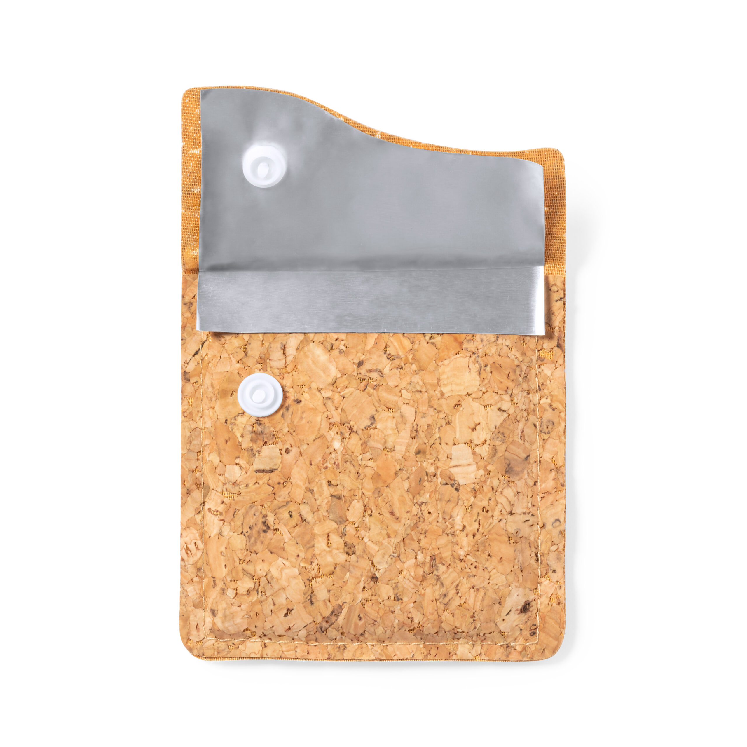 Cenicero de bolsillo de línea nature, con exterior en corcho natural e interior en aluminio ignífugo. Original solapa con cierre de corchete.
