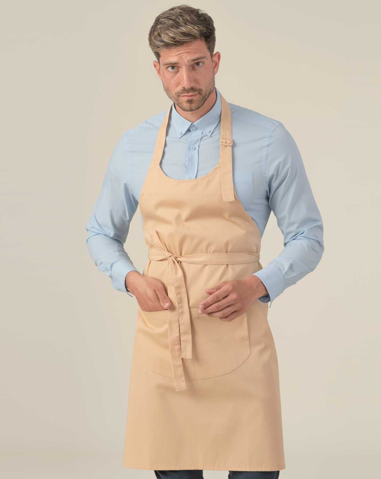 Delantal largo unisex de cuerpo entero. Cinta de cuello ajustable con hebilla deslizante de plástico.Dos cintas en la cintura.Gran bolsillo frontal doble.