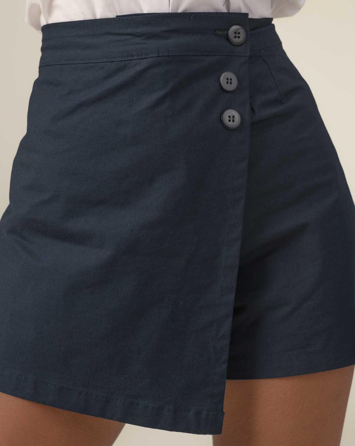 Falda pantalón de mujer con cierre de cremallera y cuatro botones a tono. Un bolsillo en el lado izquierdo de la espalda.