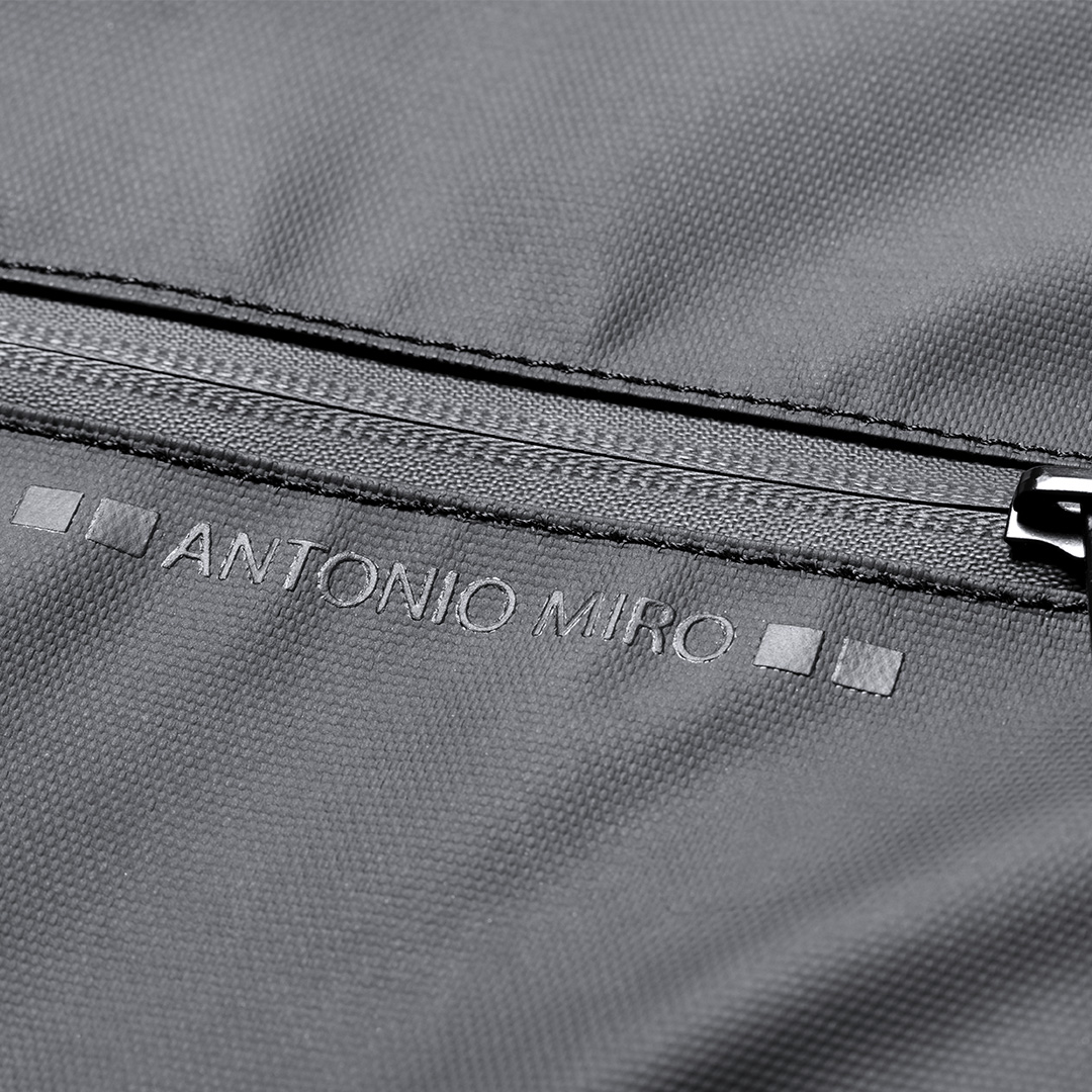 Funda de ordenador de Antonio Miró en calidad premium, fabricada en resistente poliéster 600D. De sobrio diseño y con compartimento acolchado para portátil de hasta 15 pulgadas. Cierres de cremallera con tiradores metálicos y bolsillo frontal. Logotipo de la marca en frontal.