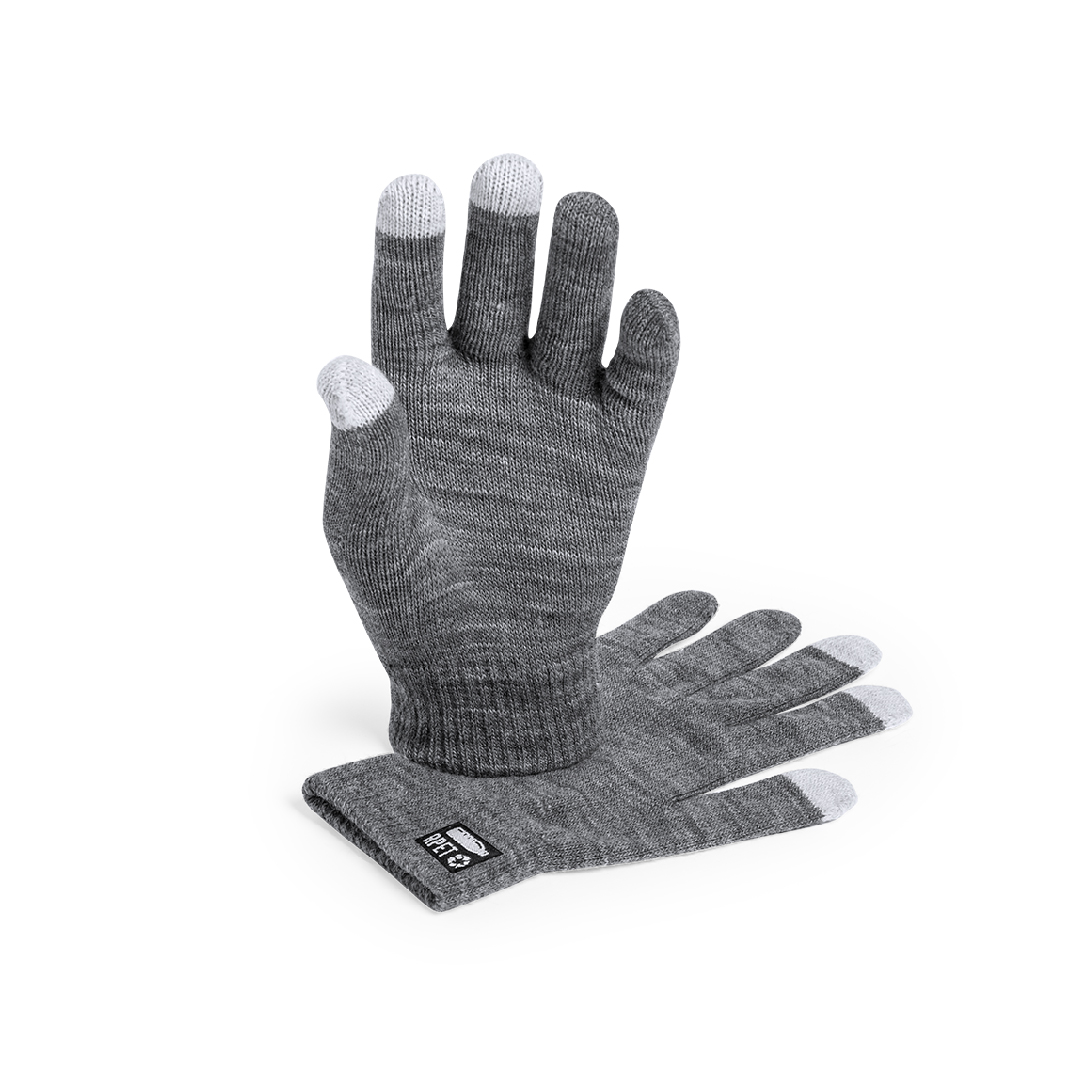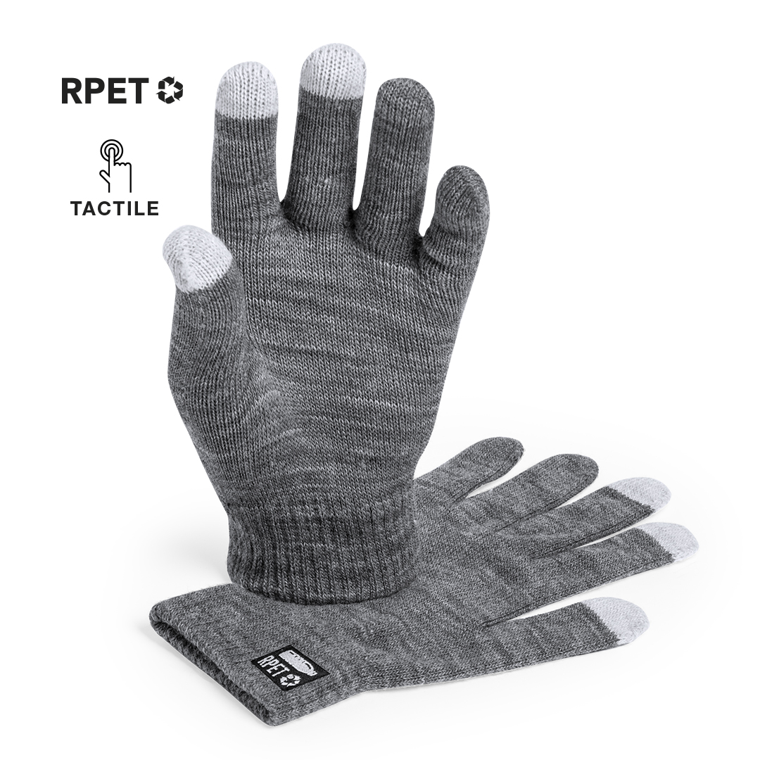 Práctico par de guantes de línea nature para dispositivos con pantalla táctil. De cálido y suave acabado poliéster RPET, elaborado a partir de plástico reciclado para así fomentar la reutilización de residuos plásticos y contribuir a la sostenibilidad del planeta. Función táctil en dedos corazón, índice y pulgar. Talla única adulto, con distintivo RPET en etiqueta exterior.