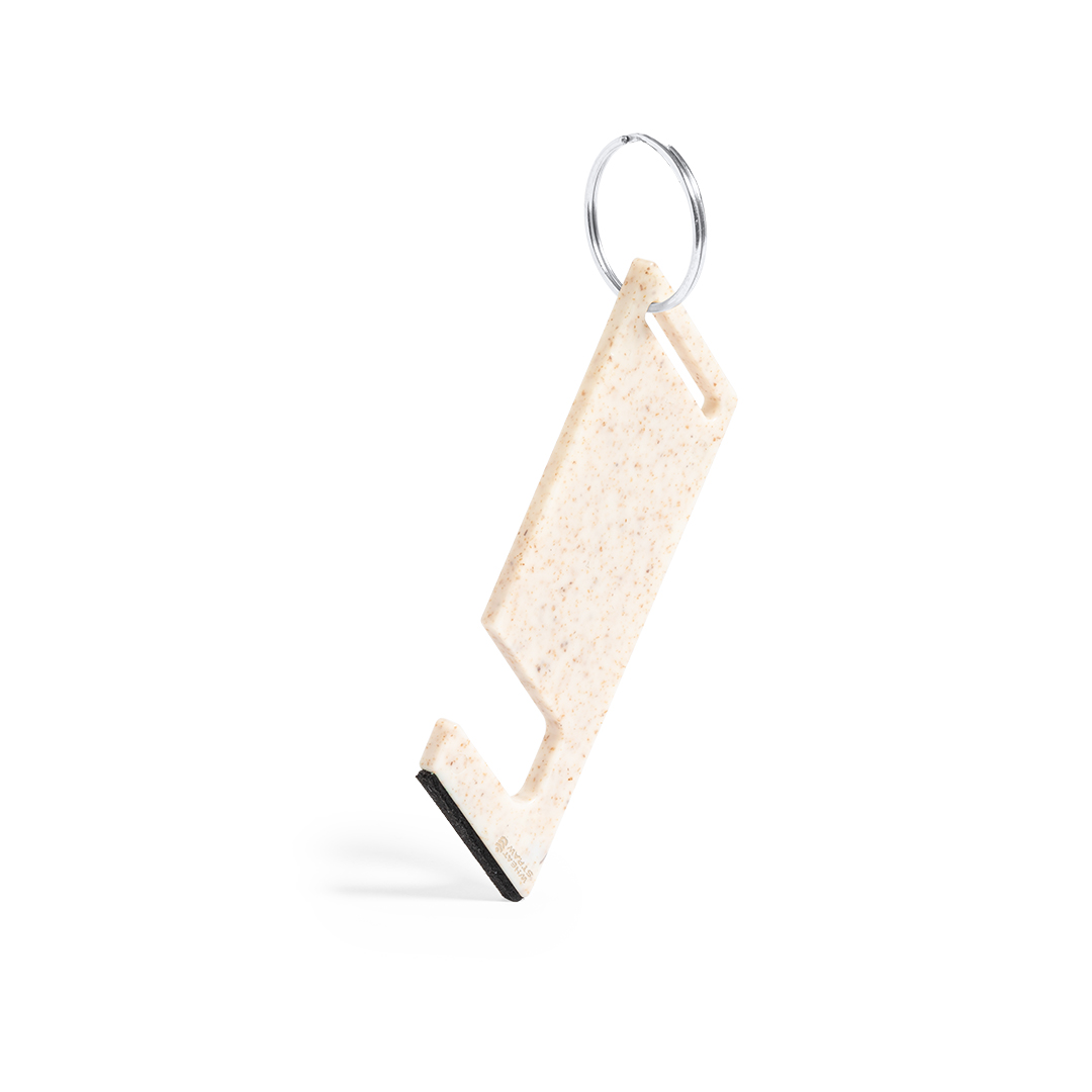 Llavero multifunción de línea nature fabricado en caña de trigo, para así fomentar la utilización de materias primas naturales y reducir las emisiones contaminantes. Con soporte para smartphone integrado y accesorio limpiapantallas incluido. Con distintivo caña de trigo en el cuerpo del llavero.