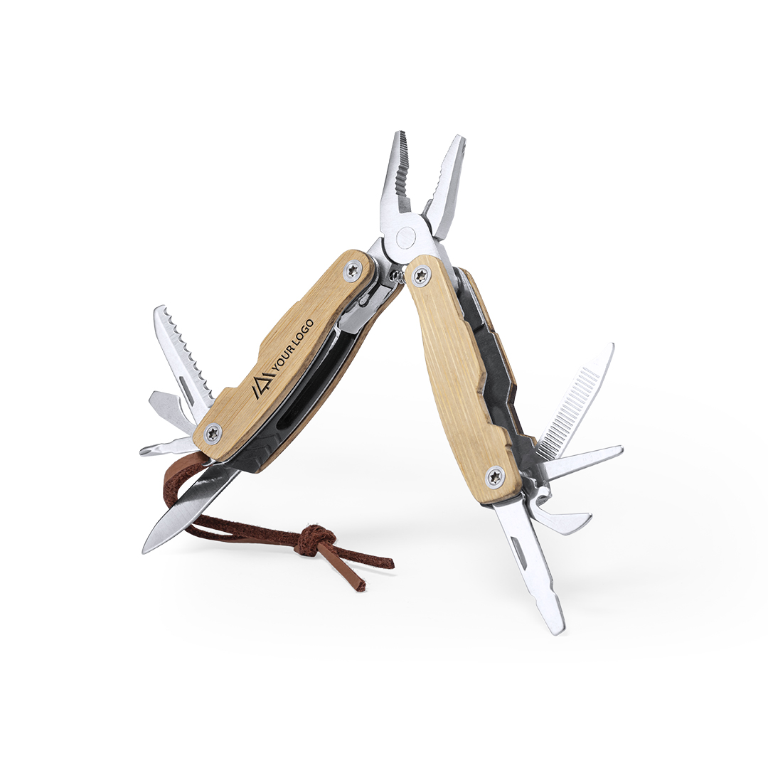 Multiherramienta con resistente cuerpo en acero inox y empuñadura de bambú, con 12 funciones. Incluye cuchillos y navajas, destornilladores, limas, abridores y alicates. Con cinta para transporte en polipiel y presentada en caja individual.