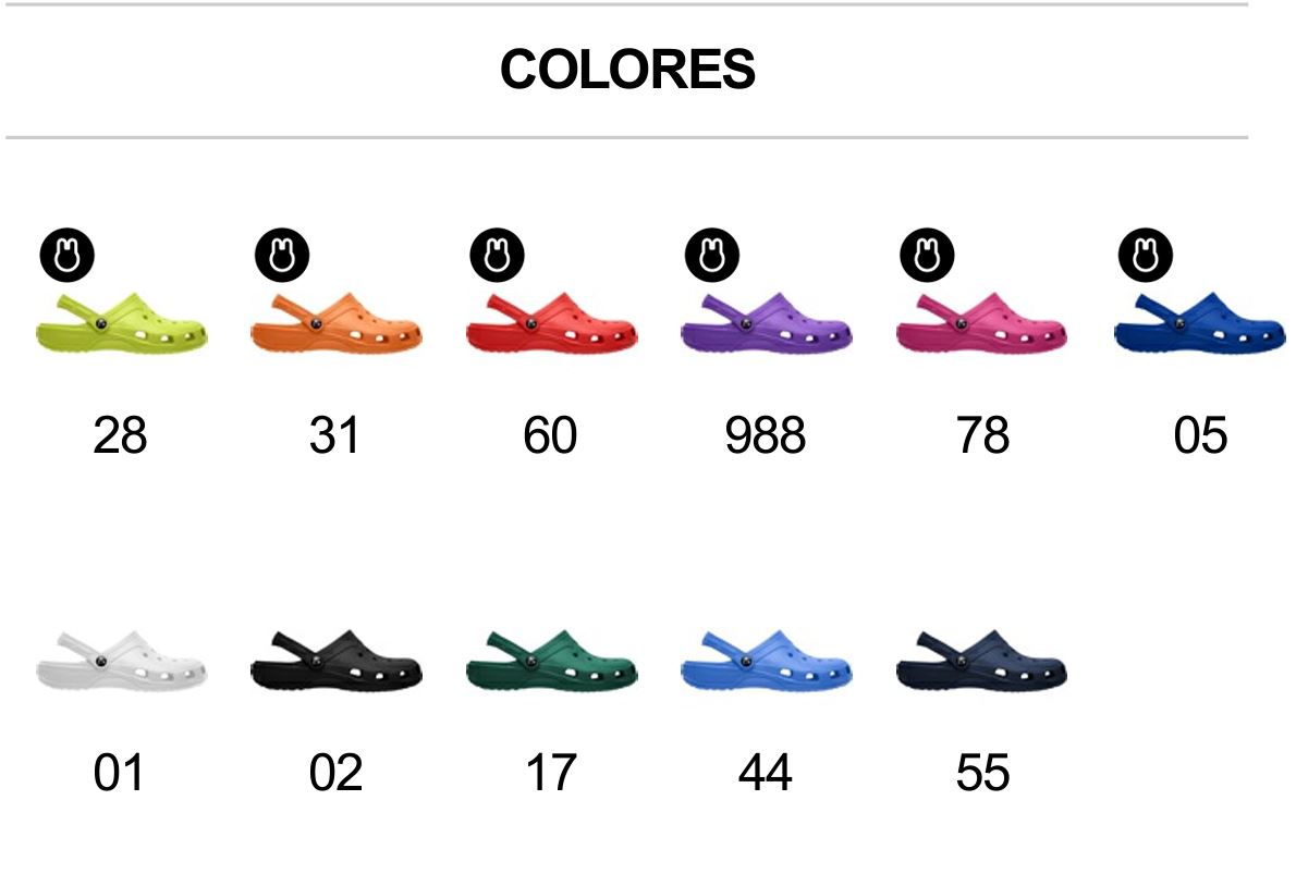 Zueco de máxima comodidad. Agujeros de ventilación y tira de sujeción de doble posición en el talón. Modelo multifuncional, para usar en tiempo libre y también ideal para personas que pasan muchas horas de pie, como trabajadores del sector alimentación, estética…
