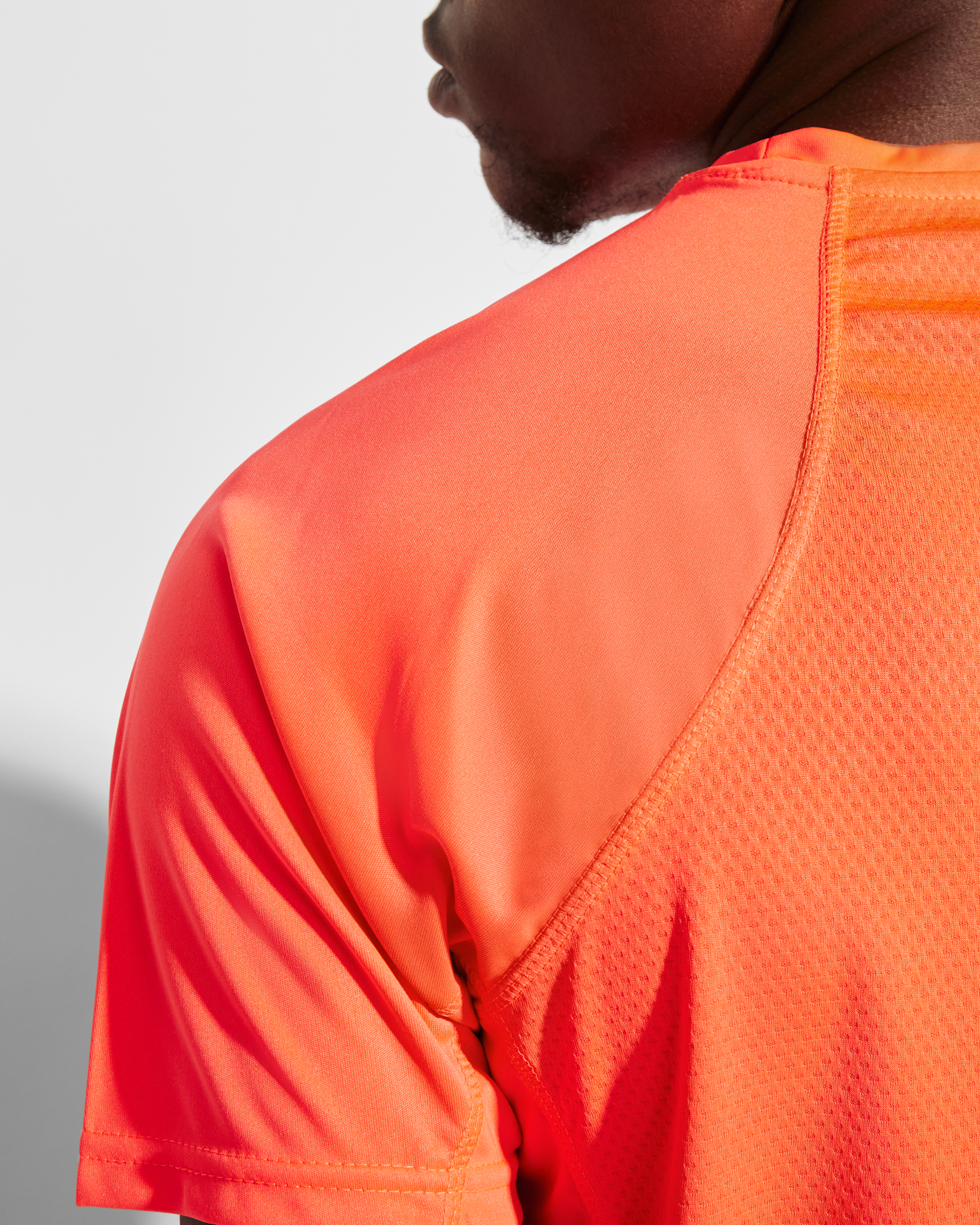 Camiseta técnica de manga ranglán unisex. Combinación de dos tejidos, frontal interlock y espalda rejilla 3D, ofrece un rendimiento versátil y suave . Cubre costuras de refuerzo a contraste en color amarillo flúor. Bajo espalda ligeramente más largo que el delantero.