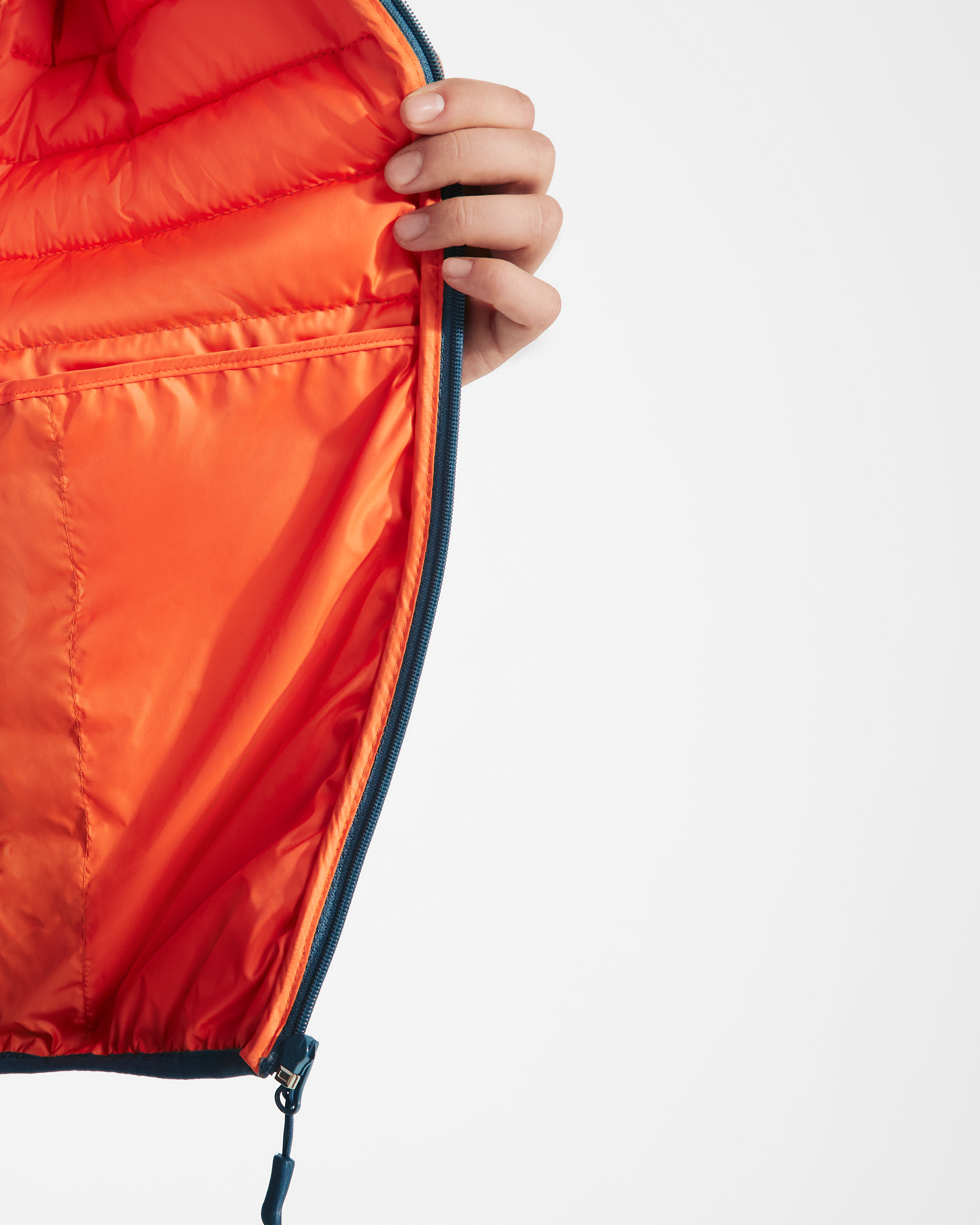 Chaqueta de hombre acolchada con relleno tacto pluma y capucha fija ajustada. ·Cremallera invertida a tono con protector de barbilla.