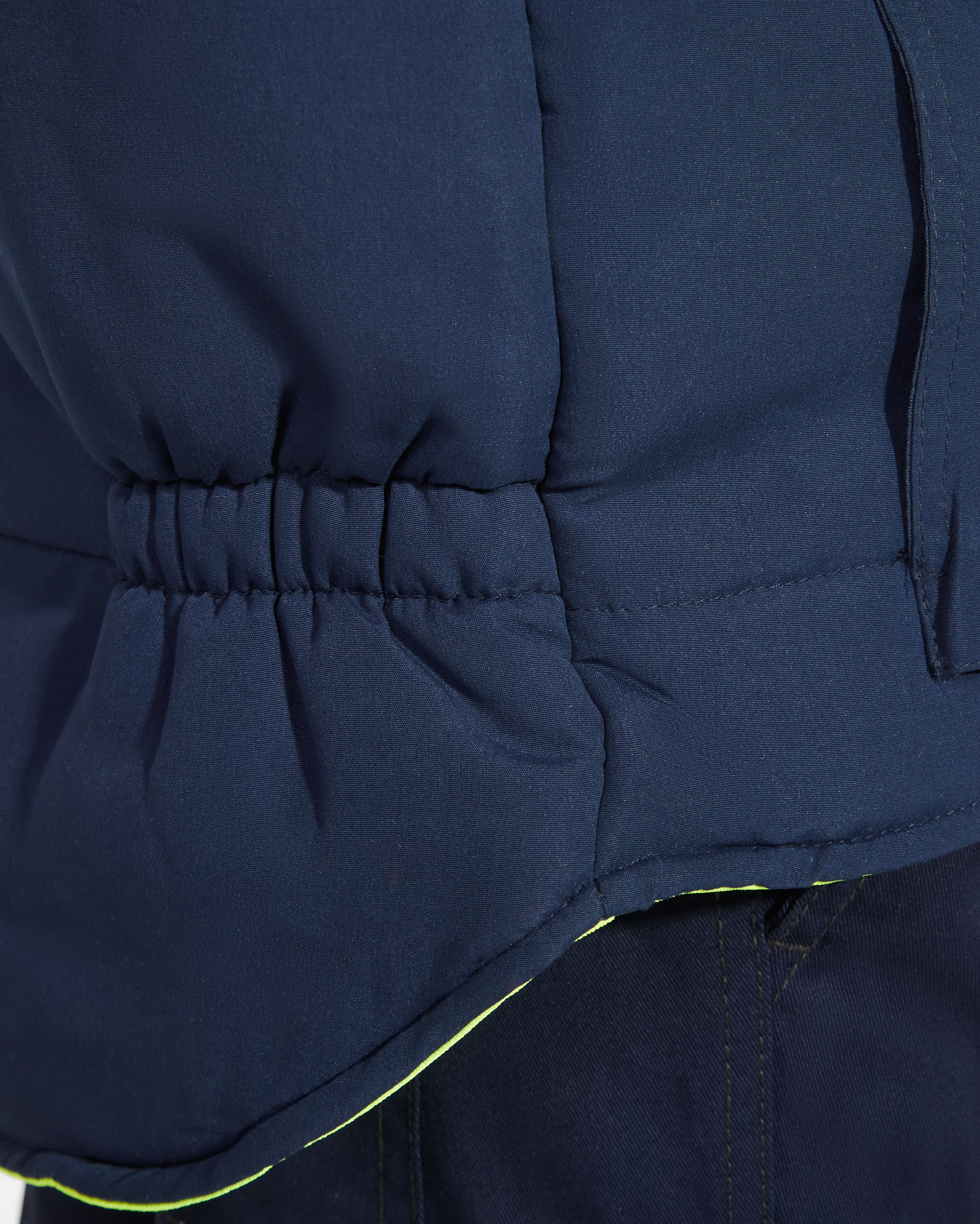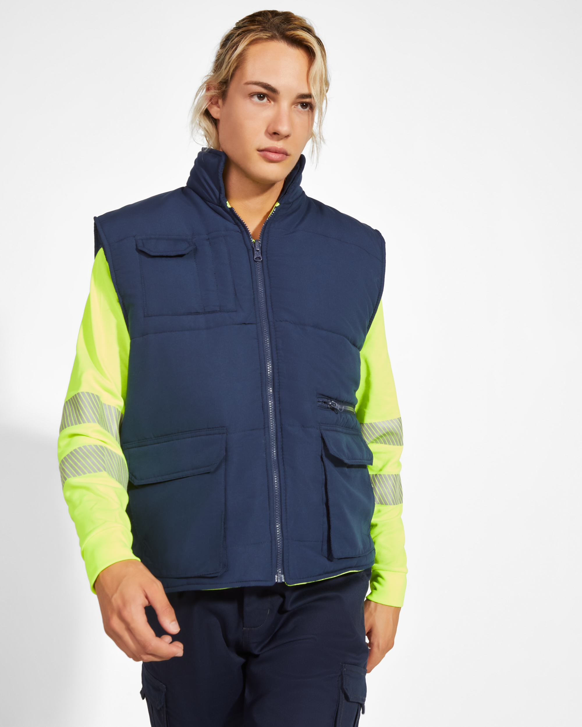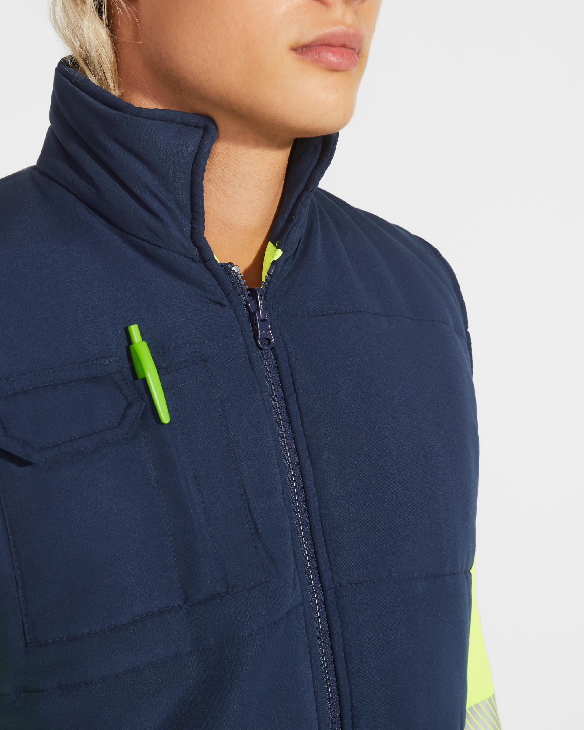 Chaleco reversible multibolsillos y alta visibilidad, con cuello alto.