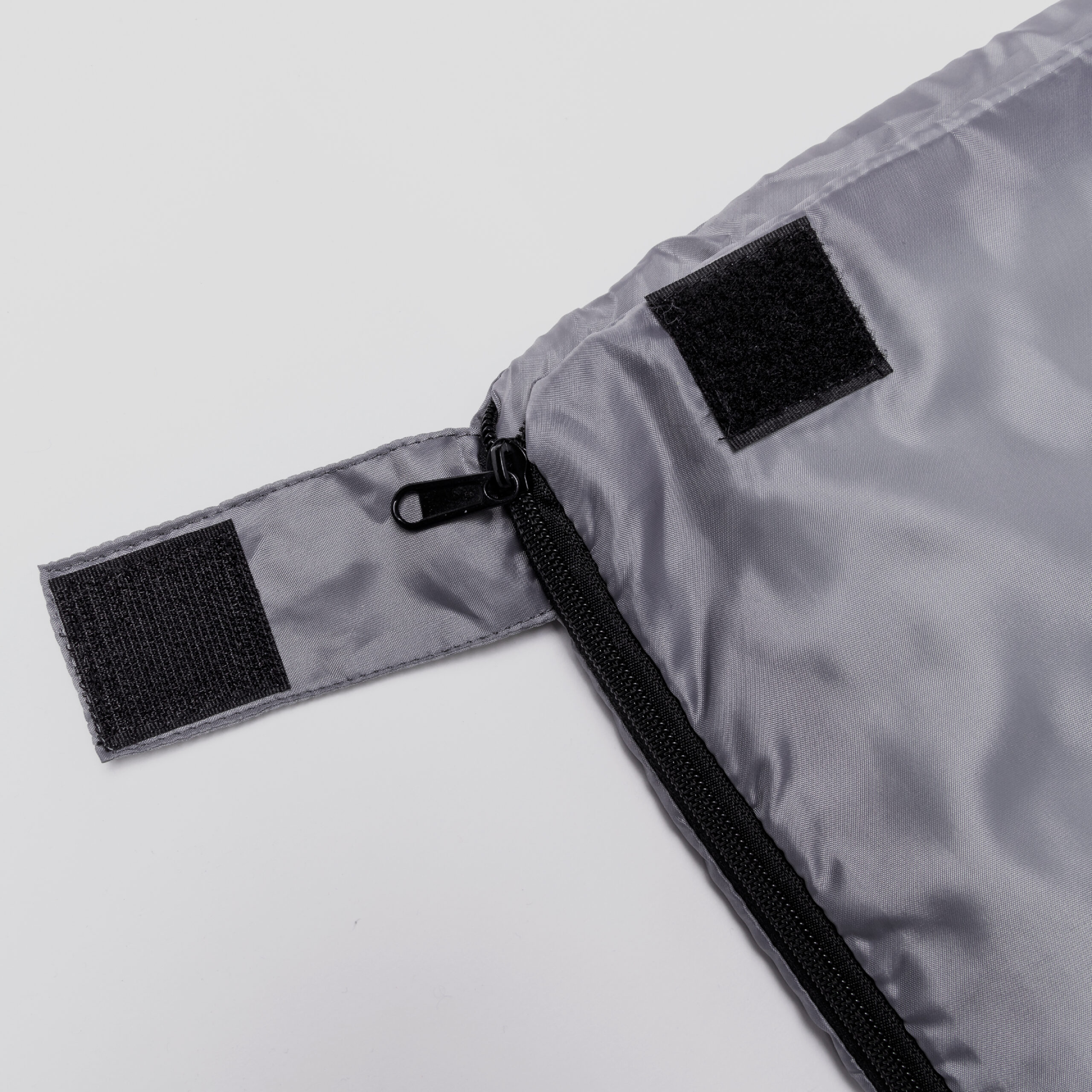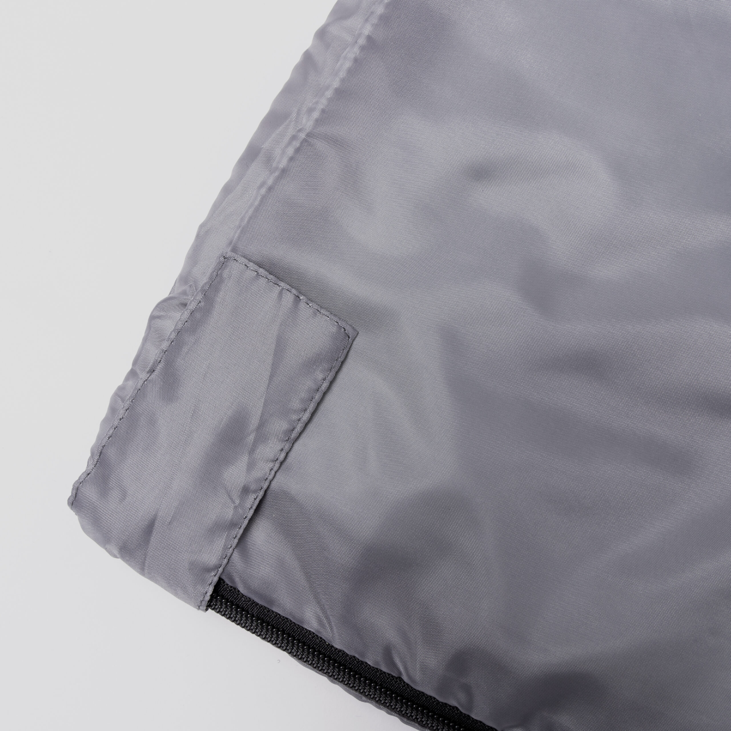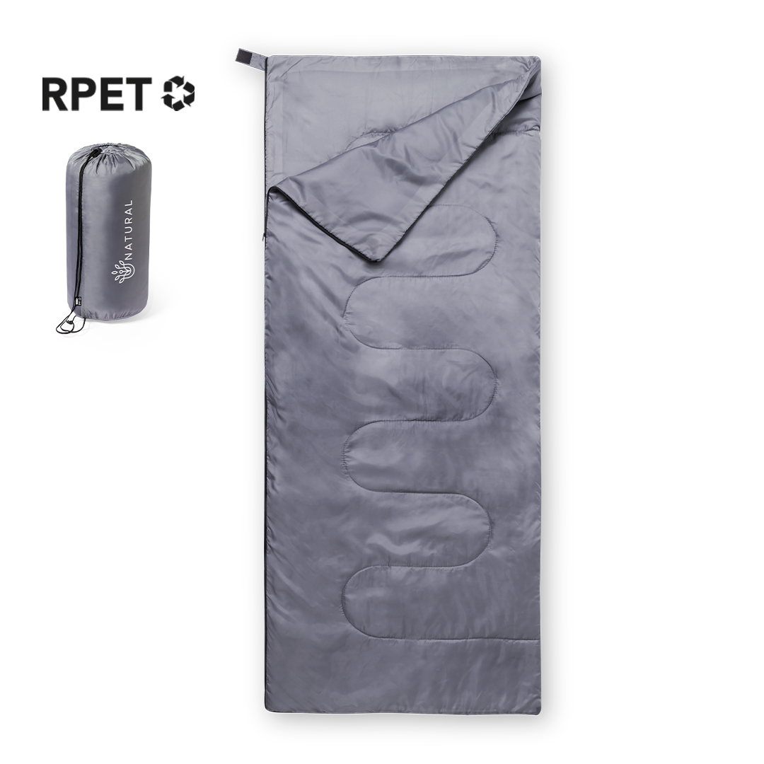 Saco de dormir fabricado en resistente poliéster RPET 190T de agradable y cálido tacto, en color gris. Con grueso acolchado interior y cierre de cremallera de apertura total; con doble tirador interior y exterior. Funda a juego en RPET, con cierre de cordón, ajustador y etiqueta exterior con distintivo RPET. El material RPET se elabora a partir de plástico reciclado, para así fomentar la reutilización de residuos plásticos y ayudar a la sostenibilidad del planeta.