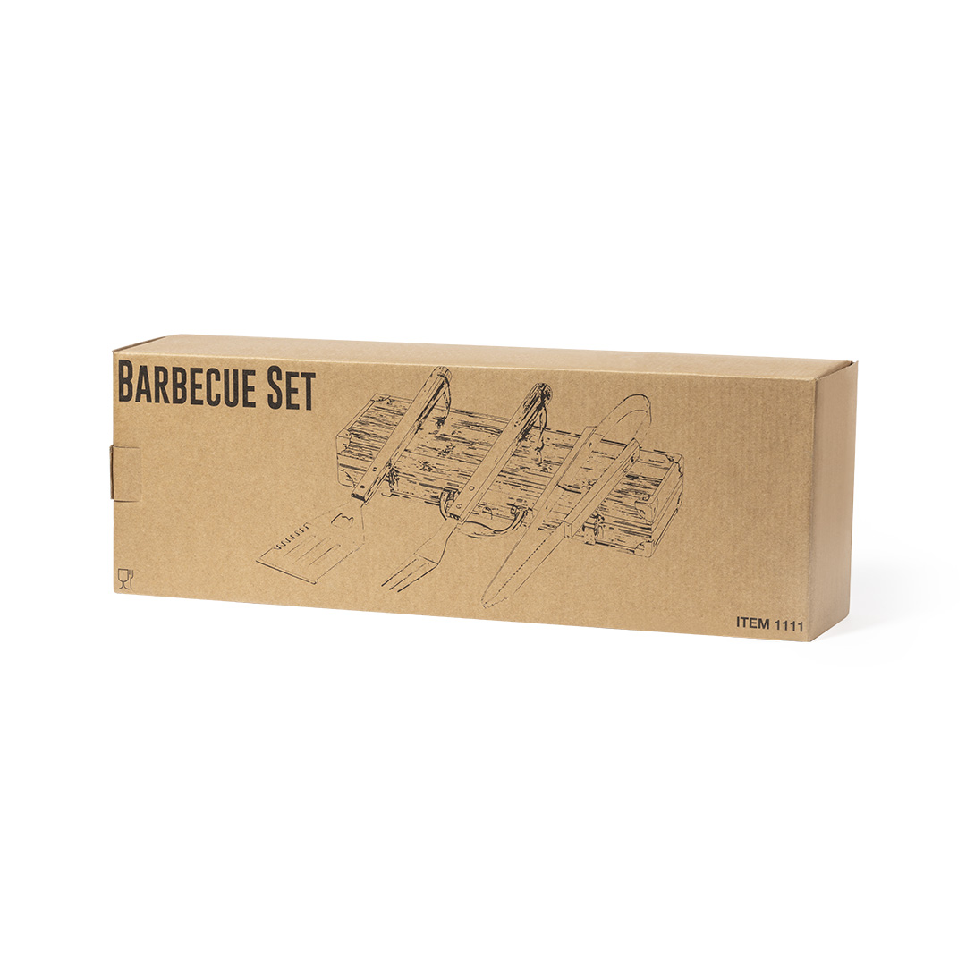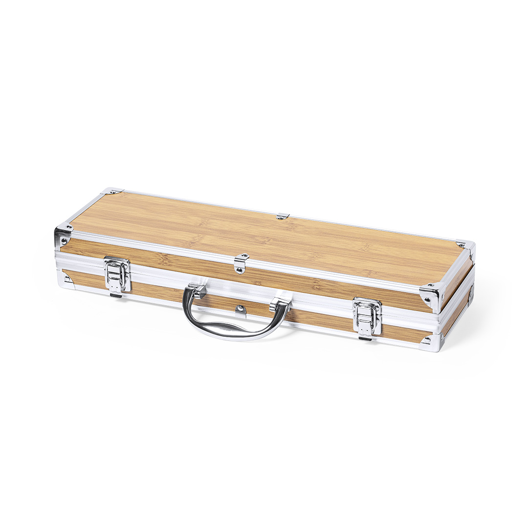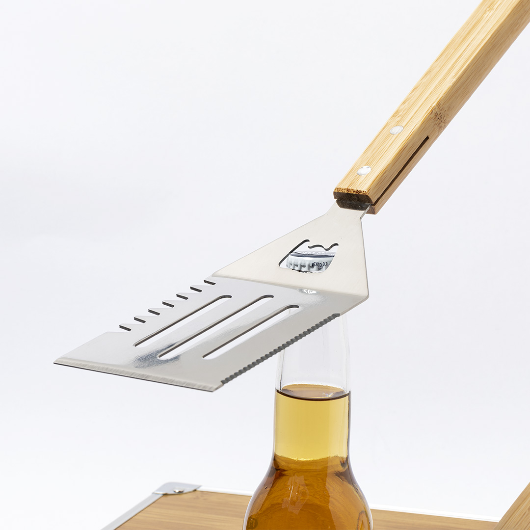 Set de barbacoa de línea nature y 3 accesorios fabricados en metal con mango de bambú. Incluye paleta con abridor, trinchador y pinzas. Presentado en estuche imitación bambú, con terminaciones en metal. Presentado en atractiva caja individual de diseño eco.