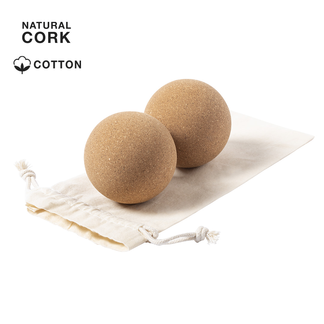 Set de 2 bolas de línea nature para la práctica del yoga y otras actividades. Fabricadas en resistente corcho natural y presentadas en funda de algodón con cierre de cordón. Con ilustraciones de ejercicios.