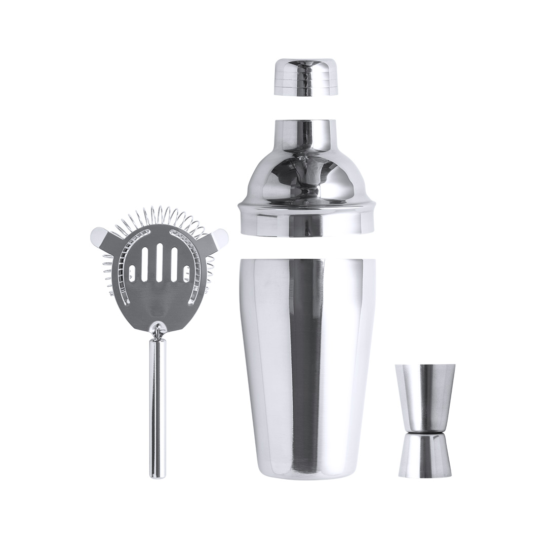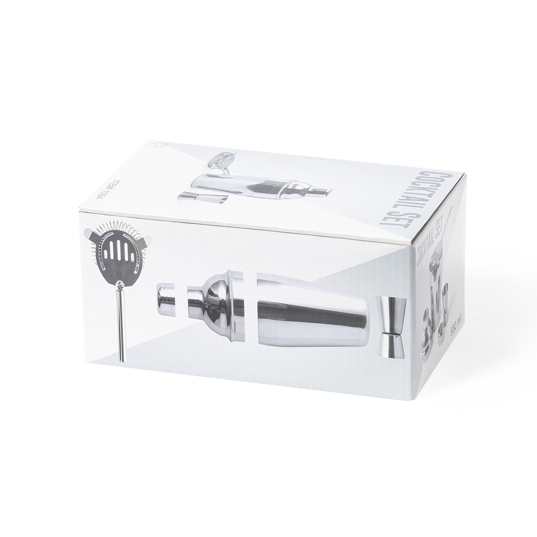 Set cóctel de 3 accesorios, fabricado en acero inox de acabado cromado. Incluye: Cocktelera de 550ml de capacidad, con cierre de seguridad y tapón dosificador en parte superior.Colador con asa.Medidor single/double.