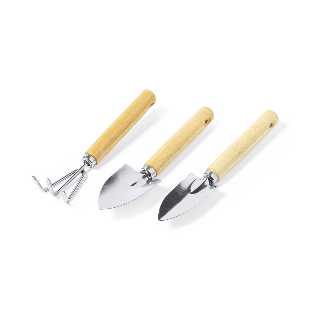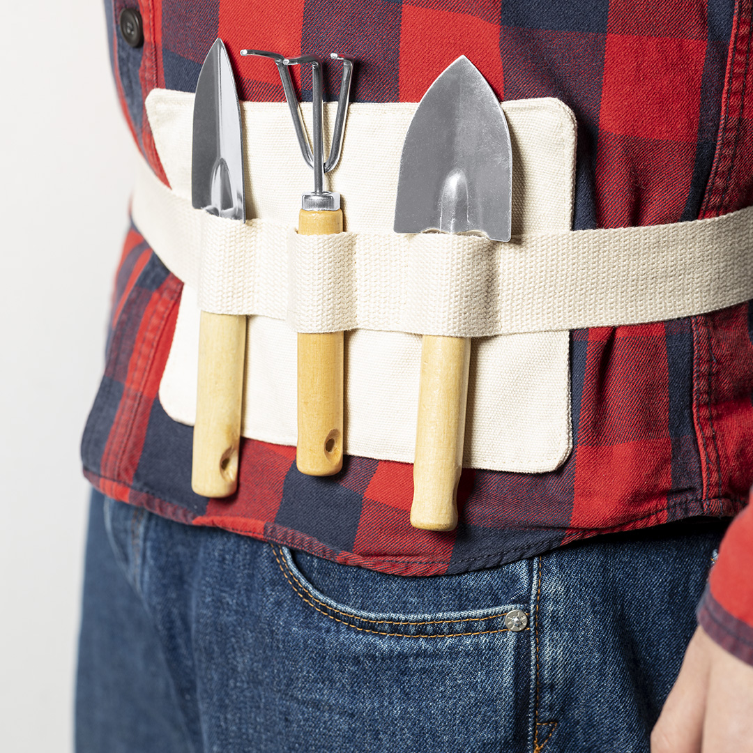 Set de jardinería de 3 accesorios, fabricado en metal con mango de madera. Incluye pala grande, pala pequeña y rastrillo. Con riñonera de transporte en algodón y cierre de click ajustable. presentado en atractiva caja de diseño eco.