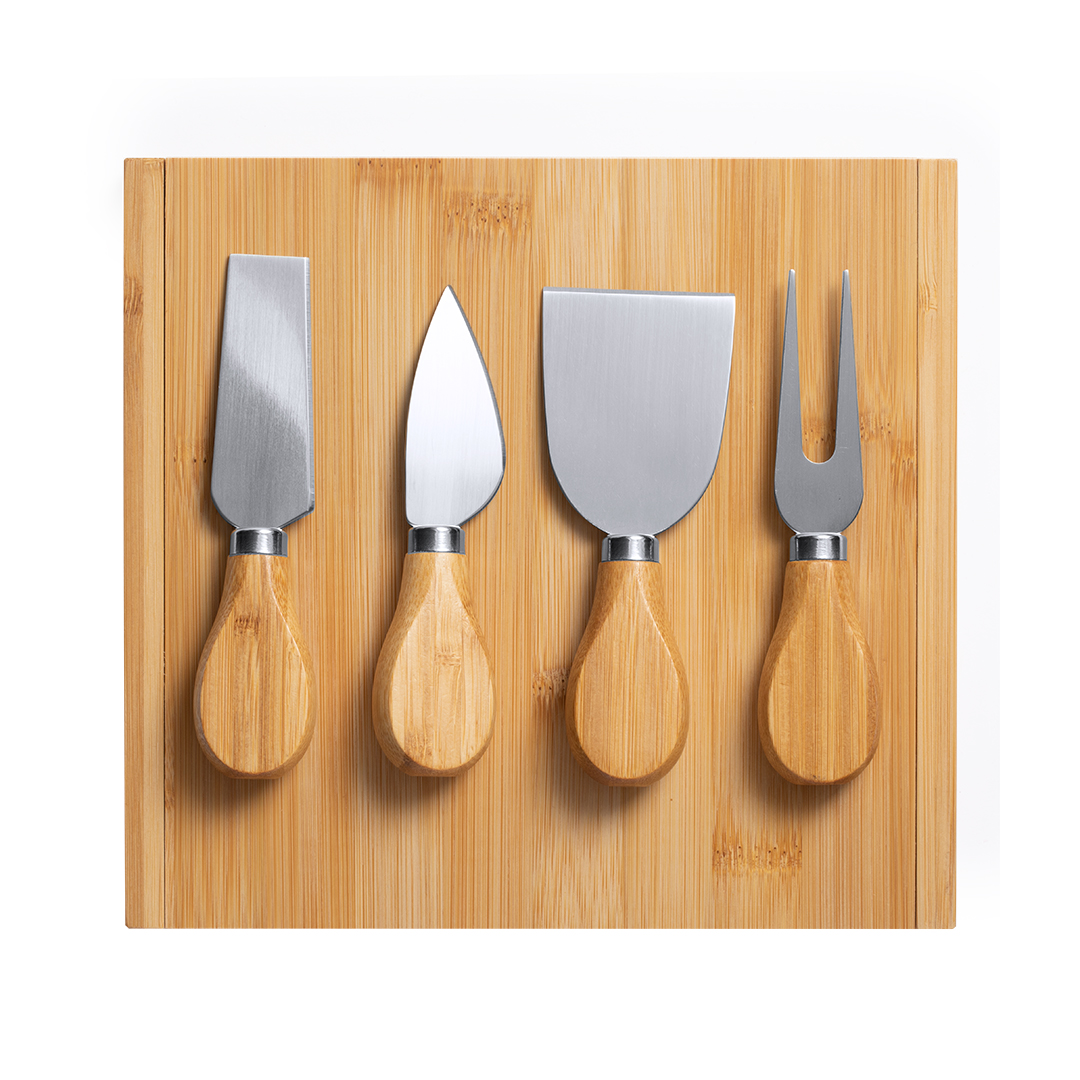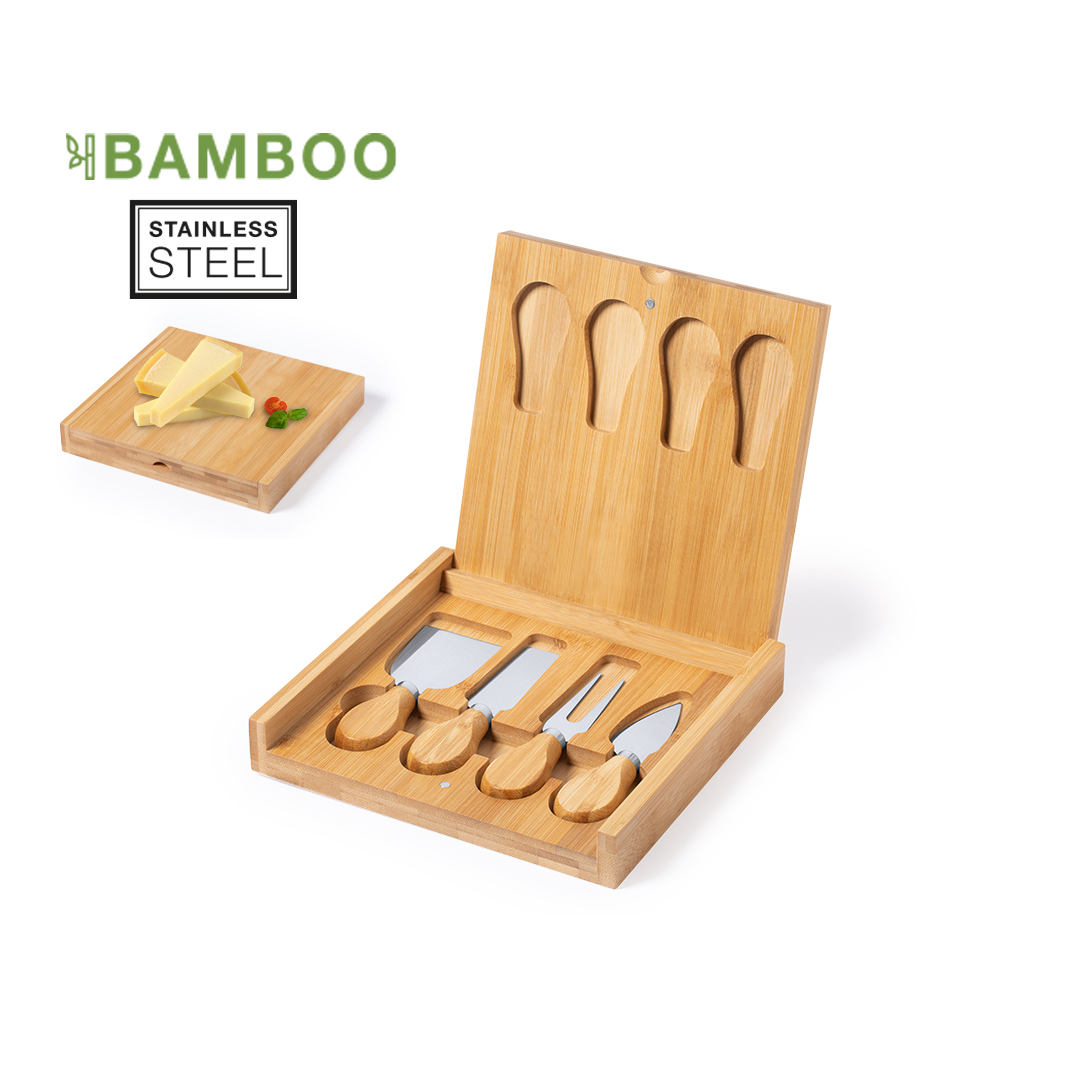Original set de quesos en caja plegable con troquelado interior para cada accesorio y en formato rectangular. Accesorios en acero inox con mango en bambú. Presentado en caja individual de diseño kraft.