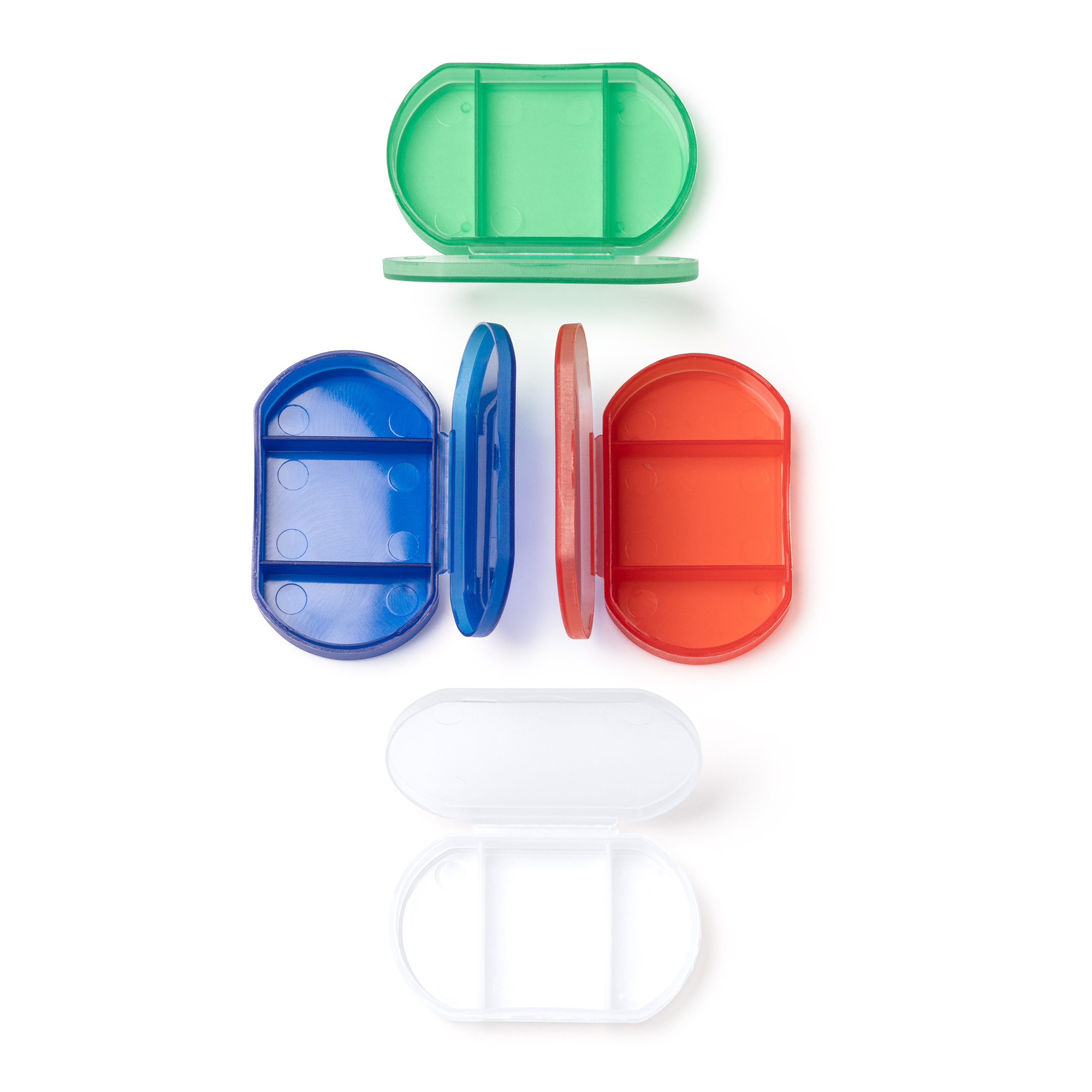 Ligero pastillero con tres compartimentos. Diseño en colorido acabado traslúcido.