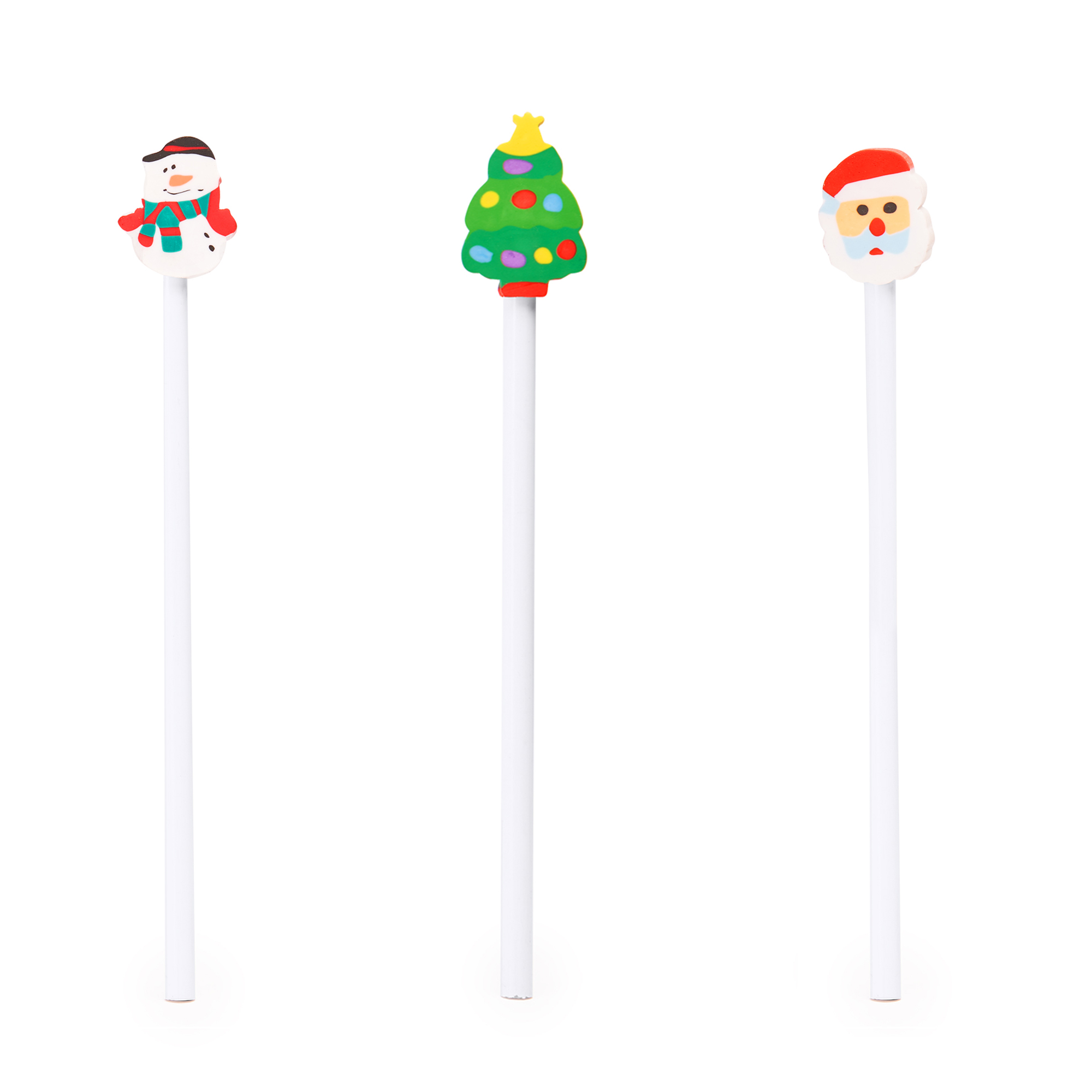 Lápiz de madera blanco y redondo con goma disponible en tres diseños navideños: árbol, Papá Noel y muñeco de nieve.