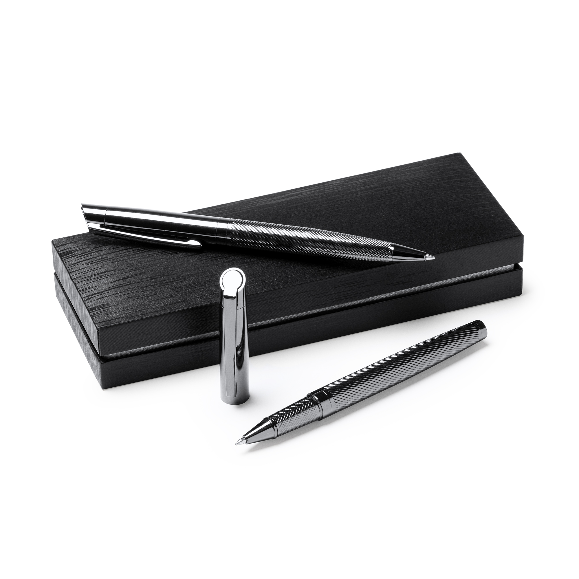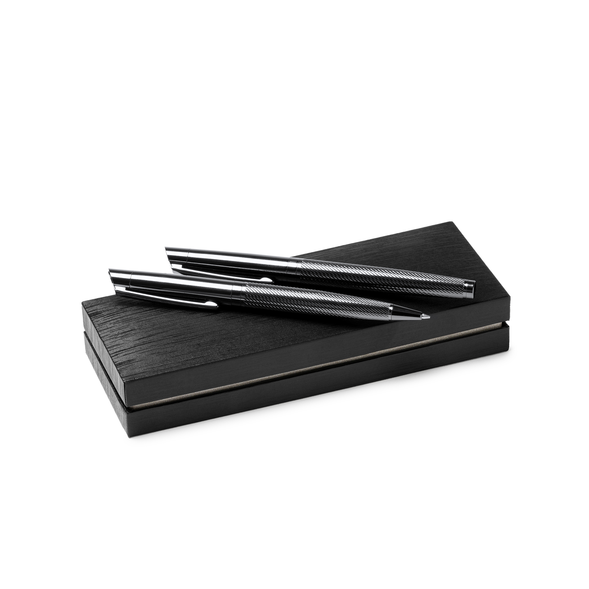 Elegante set compuesto por roller y portaminas de mecanismo giratorio. Realizados en metal de diseño oscurecido. Presentación en estuche de polipiel acolchado con forro interior.