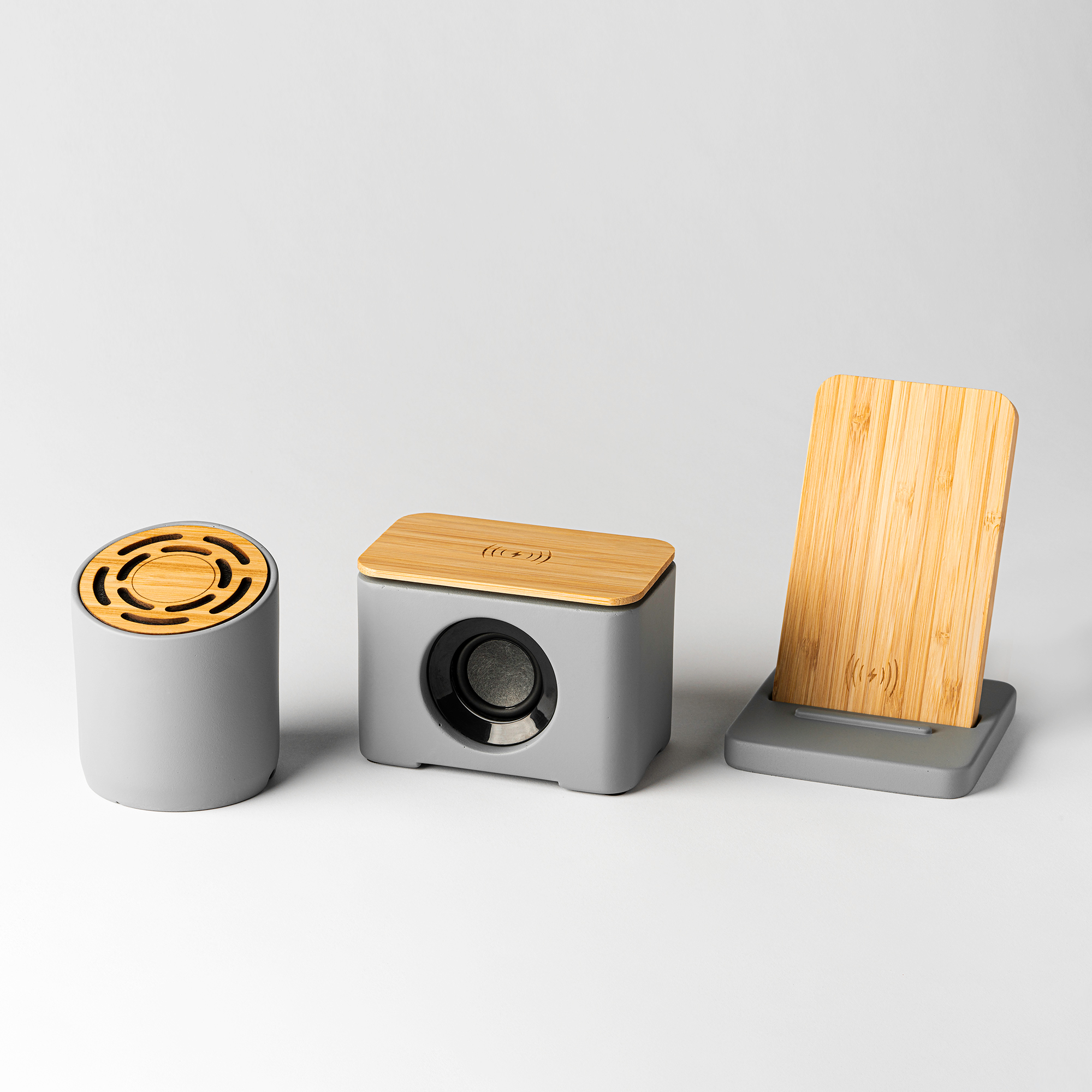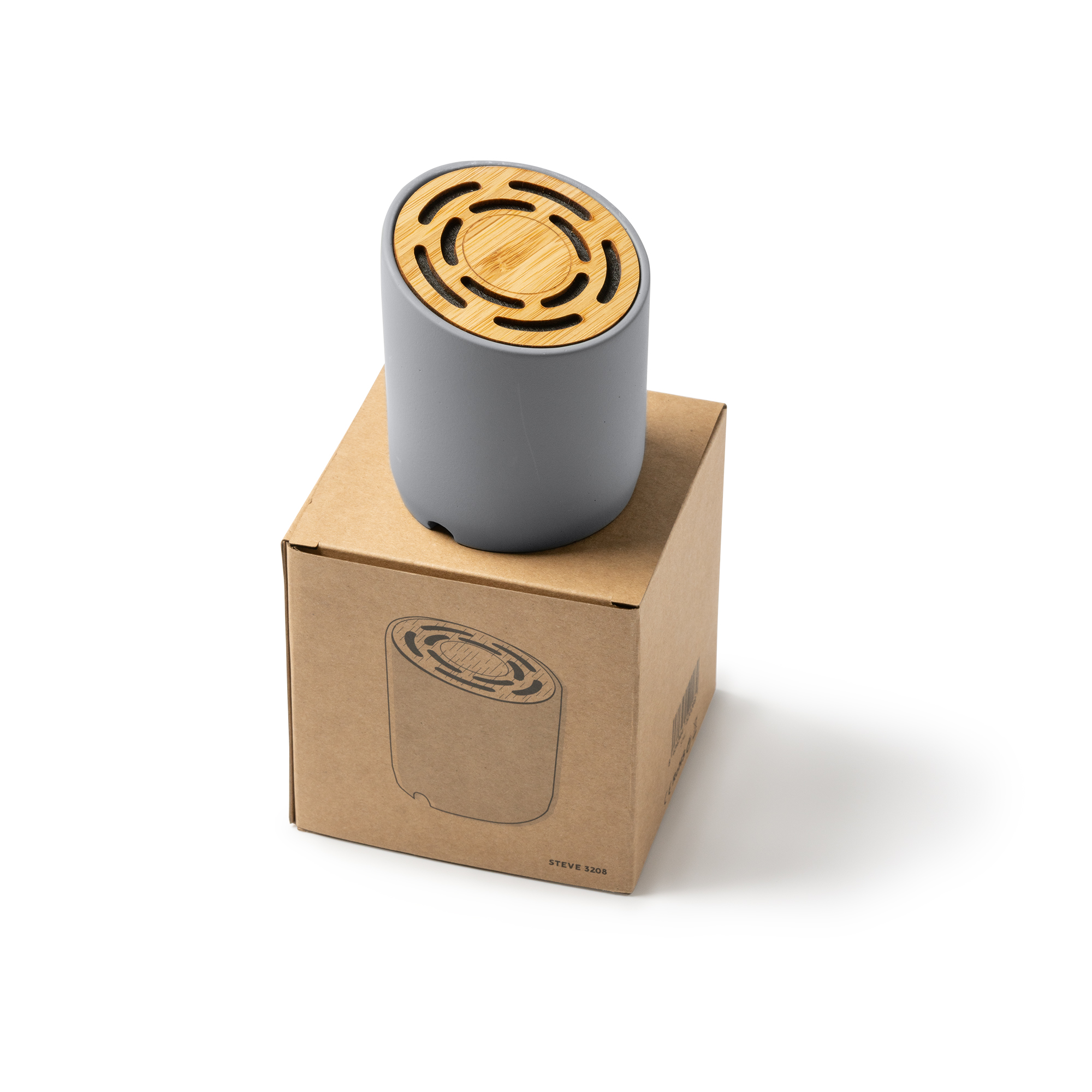 Altavoz inalámbrico Bluetooth 5.0 con cuerpo redondo de cemento y superficie de bambú natural. Potencia 3W y batería recargable. Cable de carga incluido.