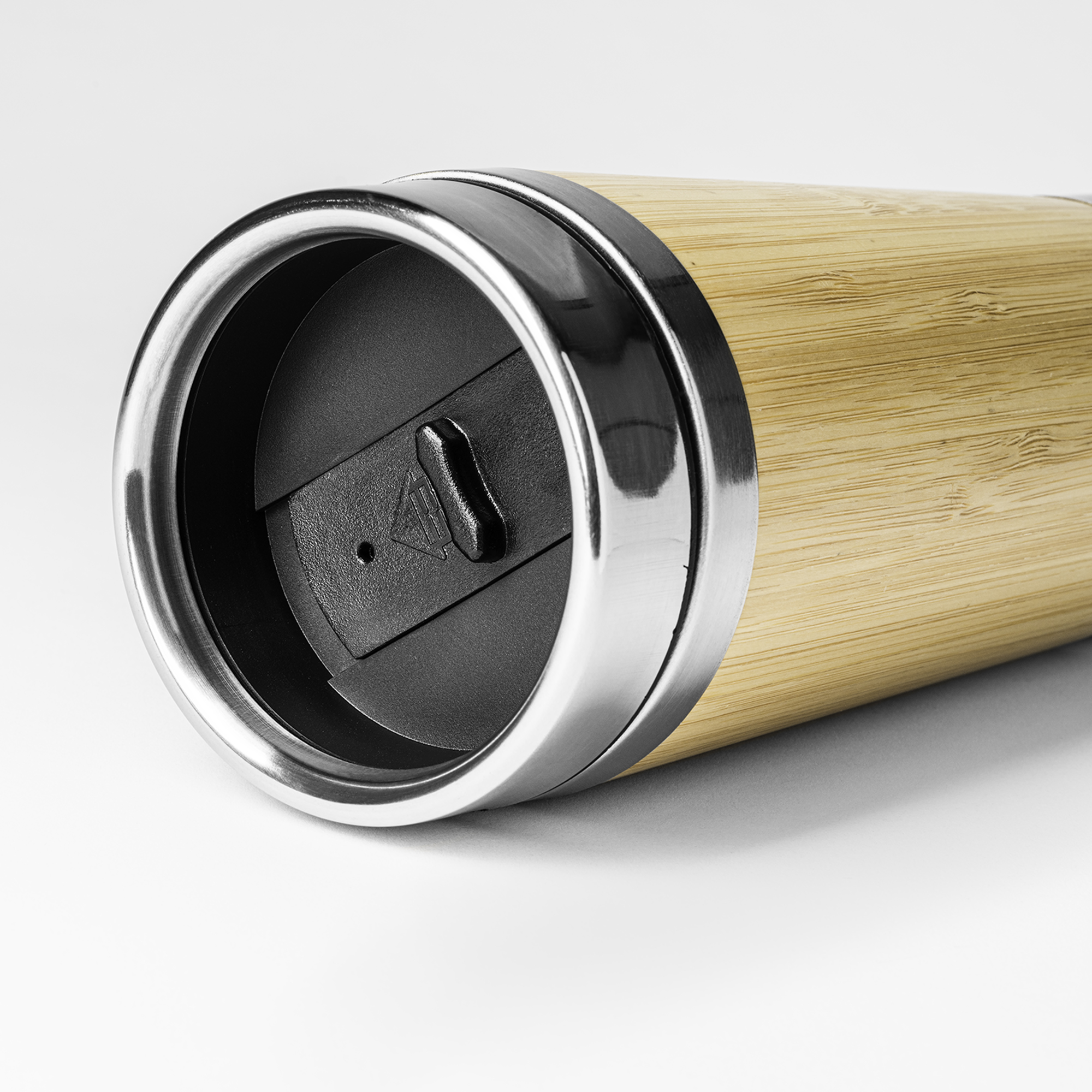Vaso de acero inoxidable 304 con pared exterior de bambú. Capacidad de 500 ml con tapa dosificador.