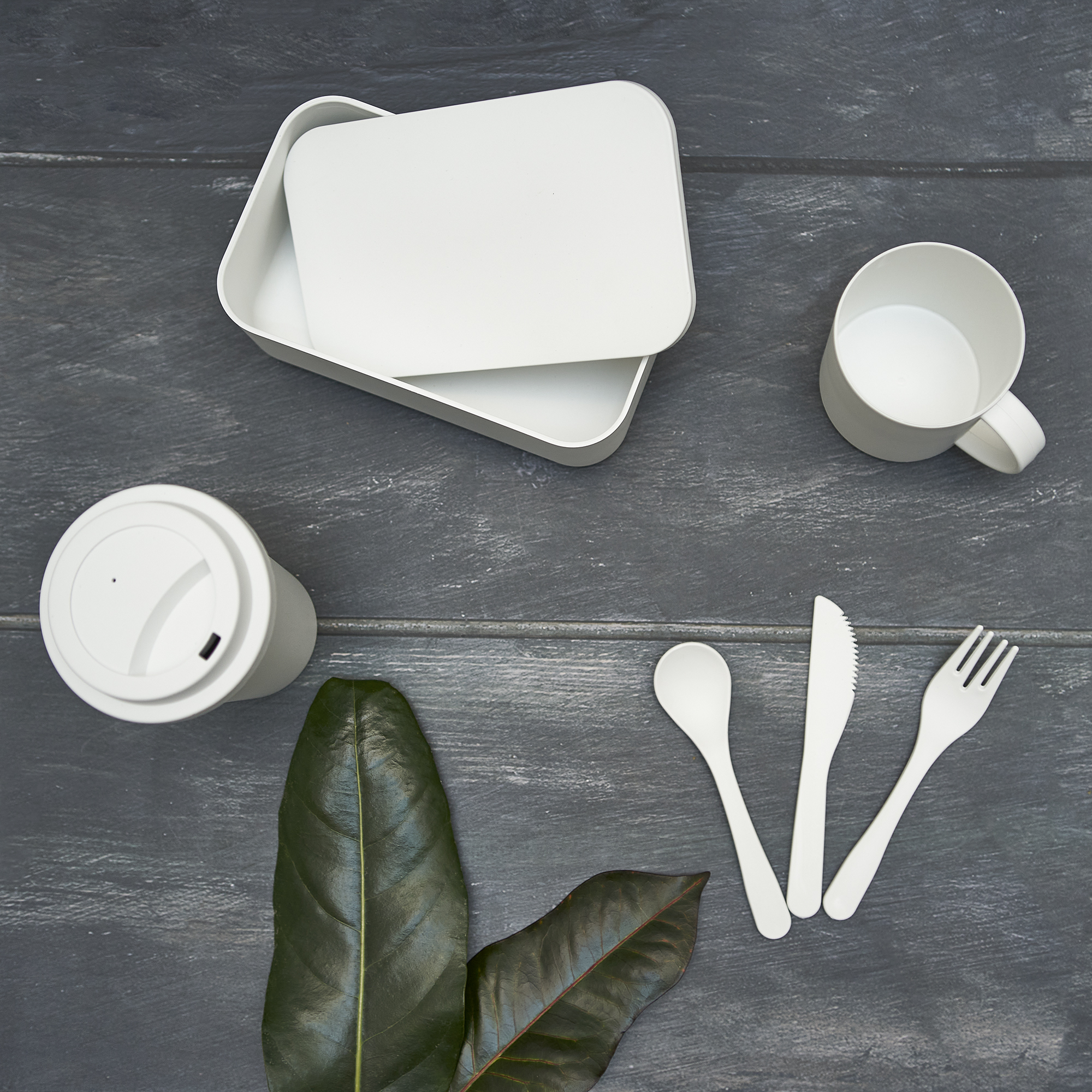 Fiambrera realizada en PLA con cinta de ajuste en silicona. Incluye Tenedor, cuchara y cuchillo. Capacidad 1 L.