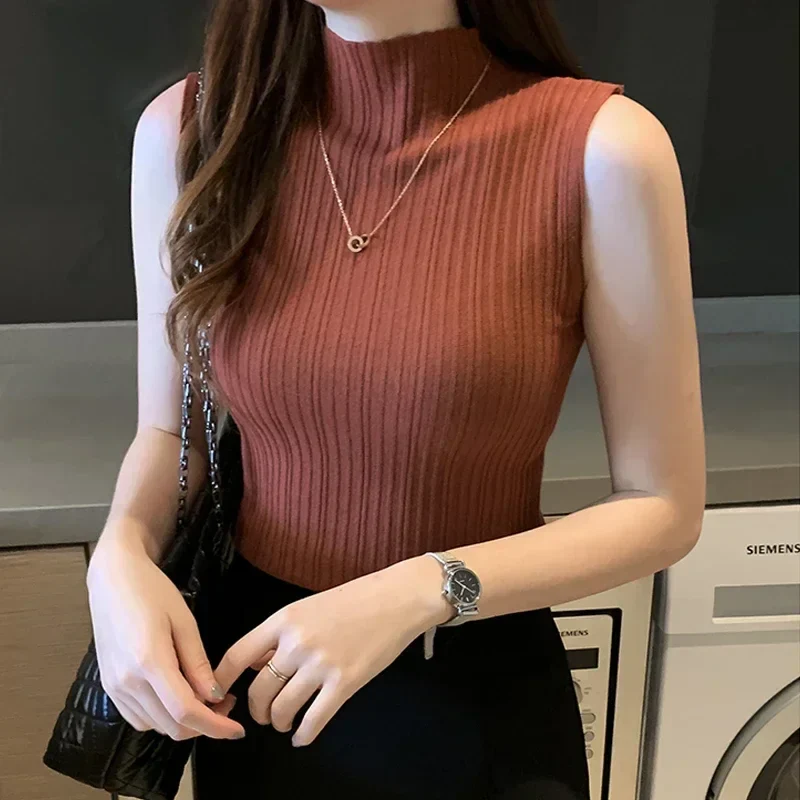 Suéter sin mangas de punto fino para mujer, camisa de cuello medio alto, blusa