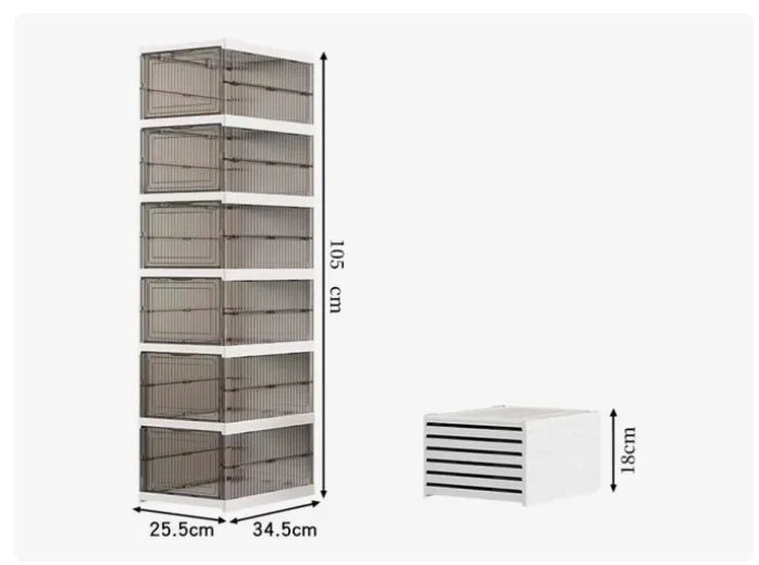 Con seis estantes y seis cajones, esta zapatera brinda suficiente capacidad de almacenamiento para tus zapatos, mientras que sus dimensiones de 1.05 m de altura, 25.5 cm de ancho y 34.5 cm de profundidad aseguran un ajuste perfecto en armarios o vestíbulos. Cada estante, con una altura de 17.5 cm y un ancho de 25.5 cm, ofrece un espacio adecuado para calzado de diferentes tamaños.